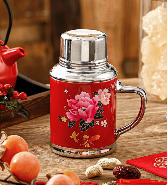 IwaiLoft レトロ アンティーク調 家飲み カップ マグ コップ コーヒーカップ レッド 赤い 朱 喜喜 コーヒーマグ かわいい 花柄 牡丹柄 モーニングカップ 中華風 来客用 誕生日 母の日 プレゼント 結婚お祝い