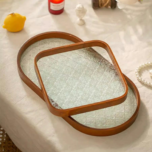 IwaiLoft 花海堂柄 フローラガラス トレー トレイ 木製 カフェトレー ガラス コースター 茶托 ティートレー おしゃれ お家カフェ 胡桃の木 お盆 おしゃれ インテリア 小物入れ