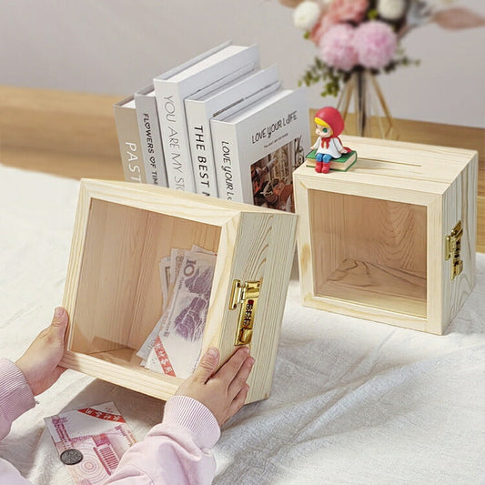 ロック付き 貯金箱 募金箱 賽銭箱 天然木 小銭 お札 フォトフレーム 透明 写真立て フィギュア 収納ボックス ガラス コインケース 木製 貯金ボックス コレクションボックス ディスプレイケース 人形ケース デコレーション 男の子 女の子 誕生日ギフト IwaiLoft