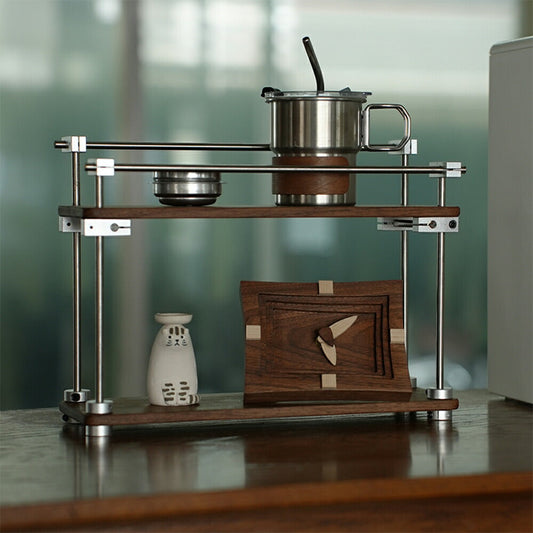 Wood Art 銘木 机上ラック 2段 木製 卓上ラック コスメ収納 長方形 ミニラック カップ収納 食器棚 卓上収納ラック ウールナット デスク上置棚 展示棚 インテリア シンプル 高級感 オープンラック オープンシェルフ コスメ 化粧品 器 収納 小物入れ 北欧 アウトドア IwaiLoft
