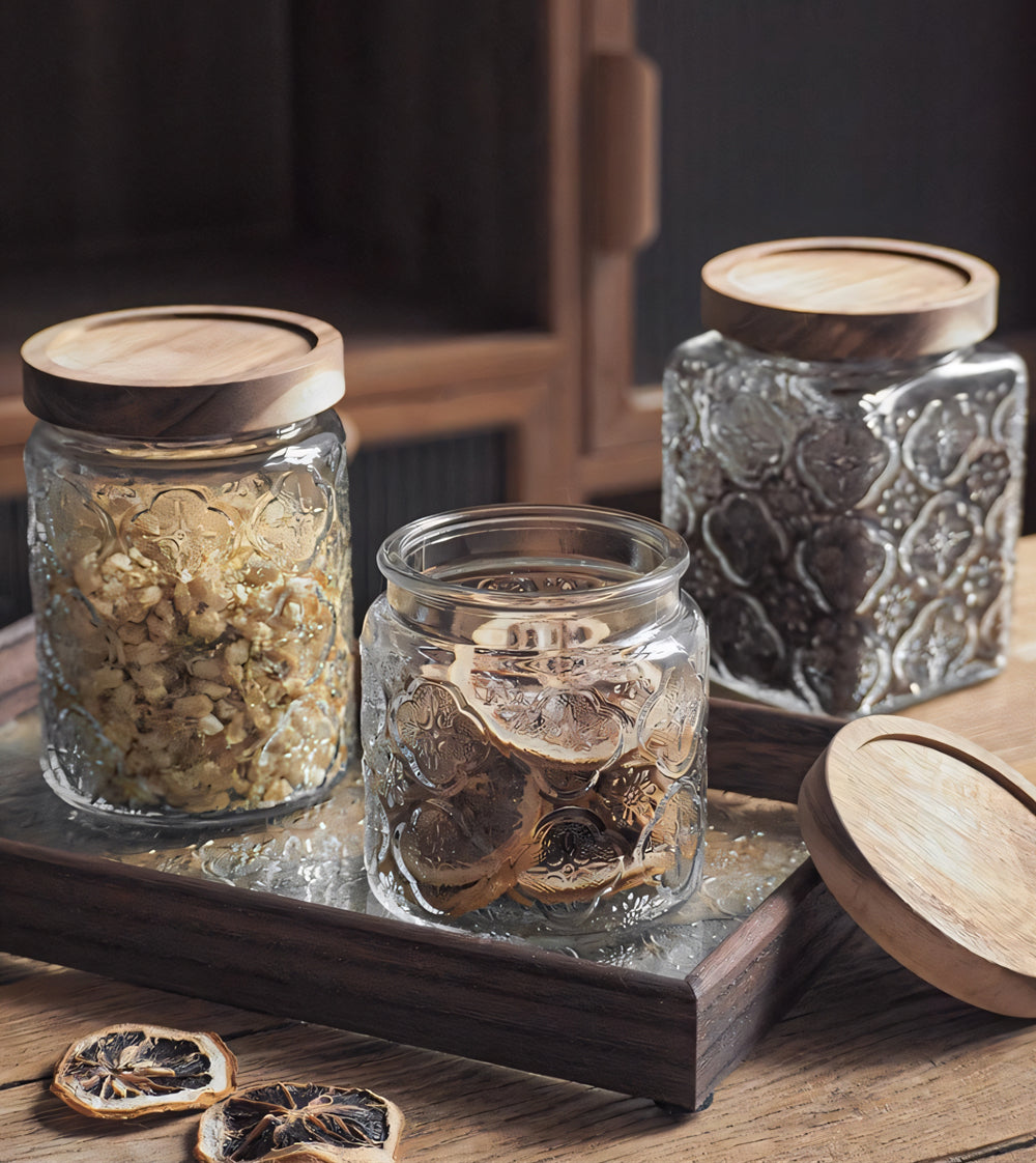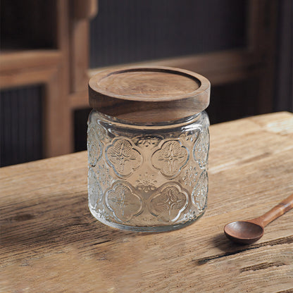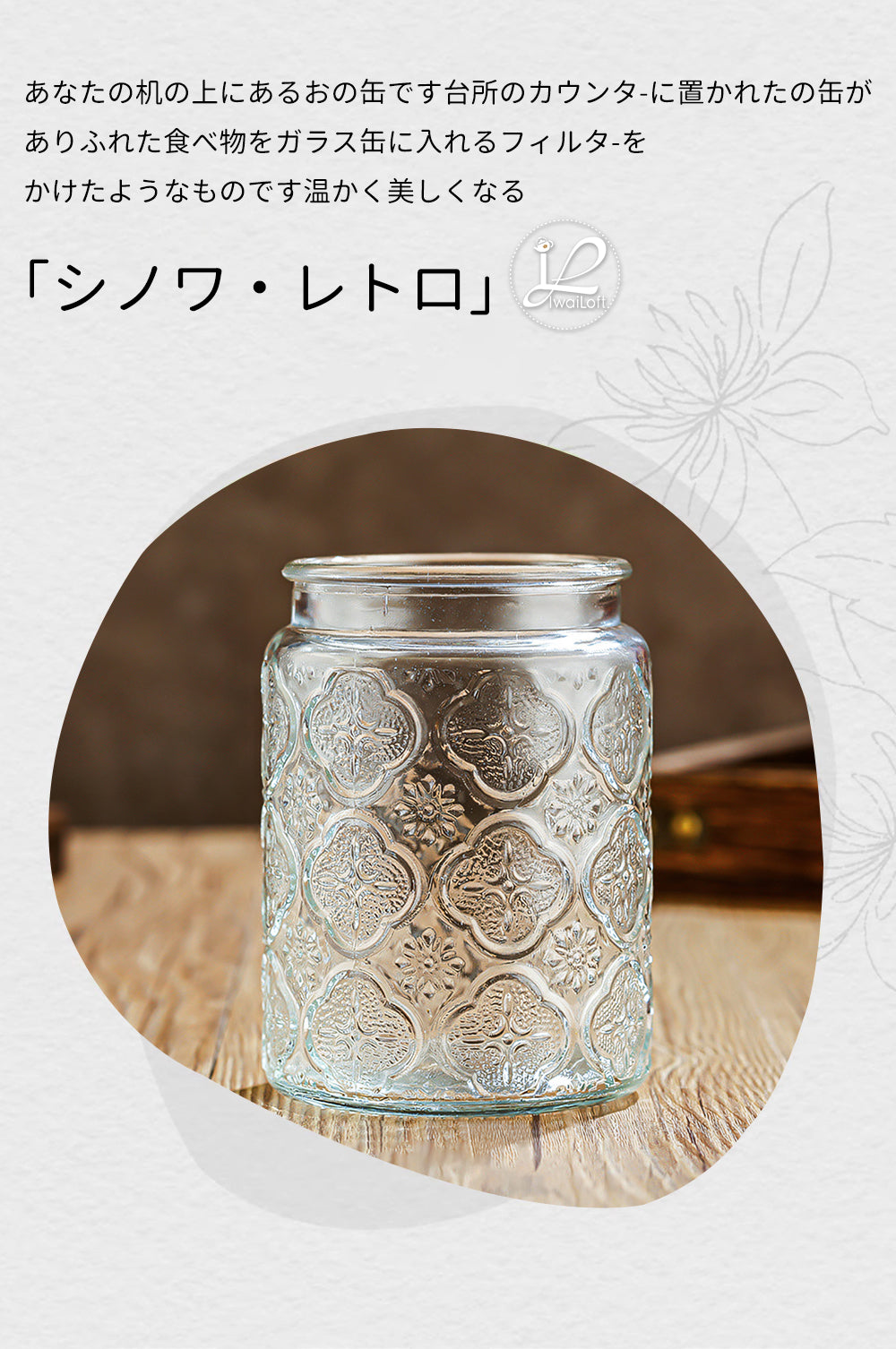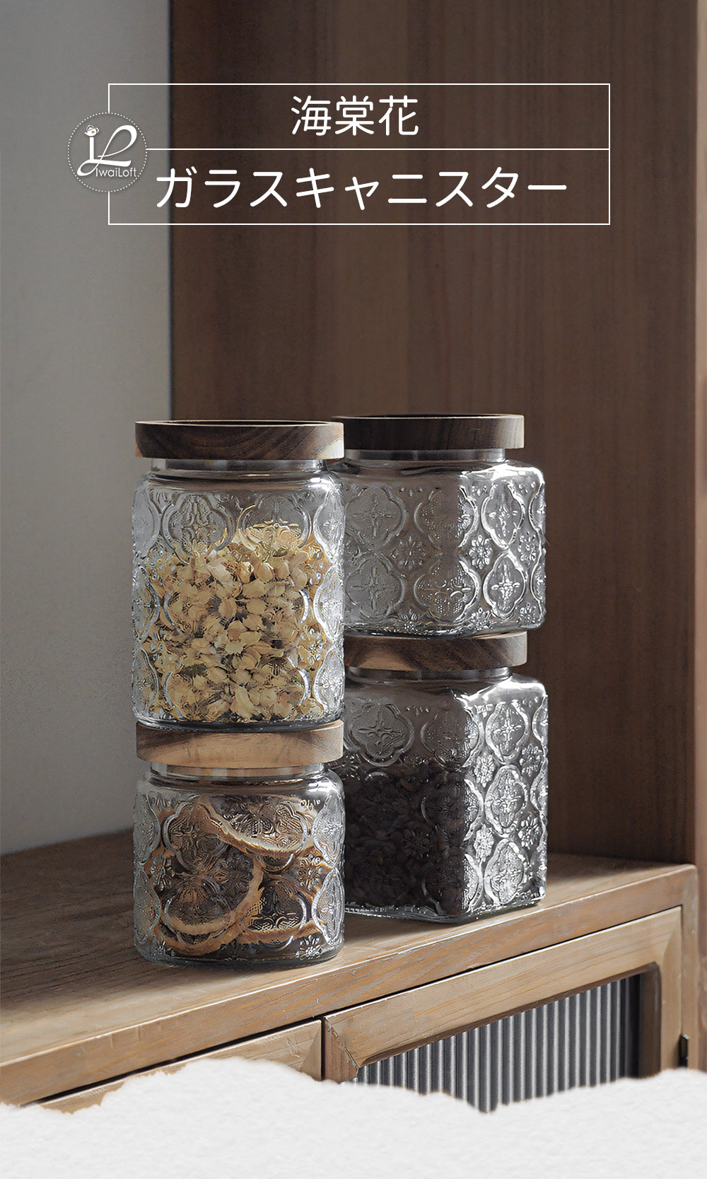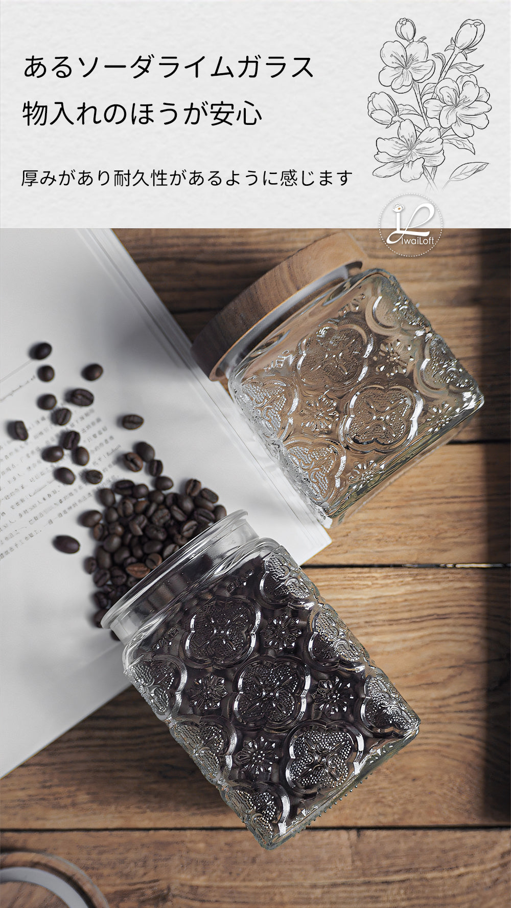 IwaiLoft 「海棠花」ガラス キャニスター コーヒー豆 保存容器 密閉 珈琲キャニスター 耐熱ガラス 梅酒びん ガラス 果実酒容器 密封ビン 茶筒 茶入 お菓子 茶葉 香料 漬物器 漬物保存容器 防湿保存 Glass Canister