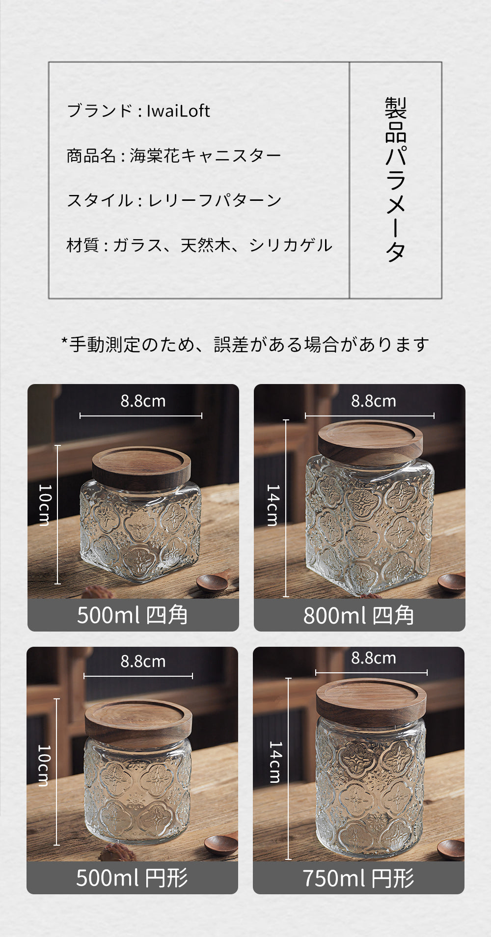 | 品質表示 | 材質:ガラス、天然木、シリカゲル 容量:約500ml/750ml/800ml 重量(個箱含む) 400g |