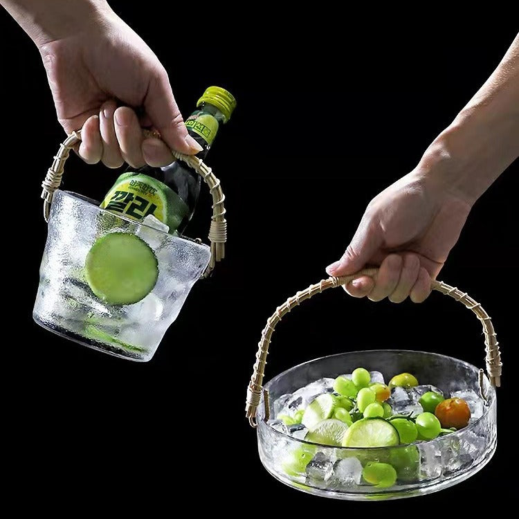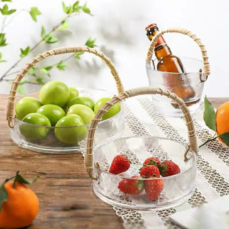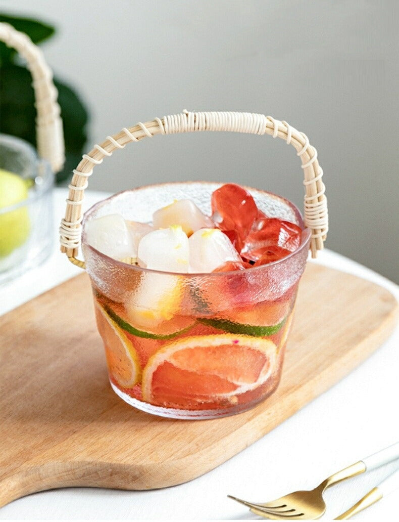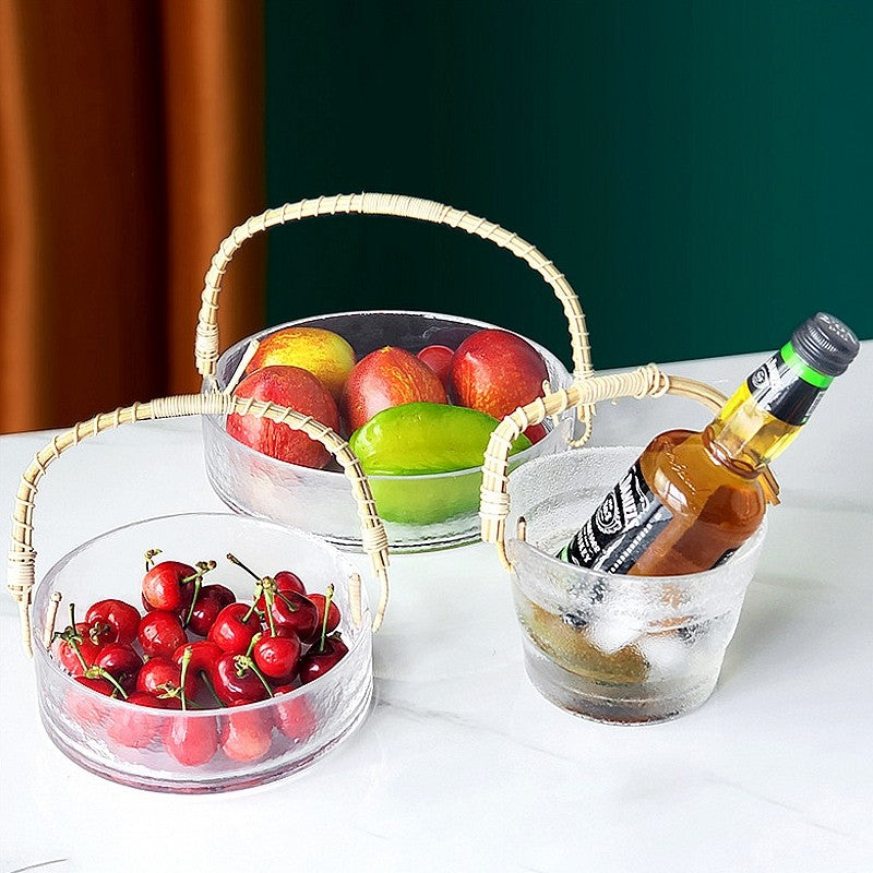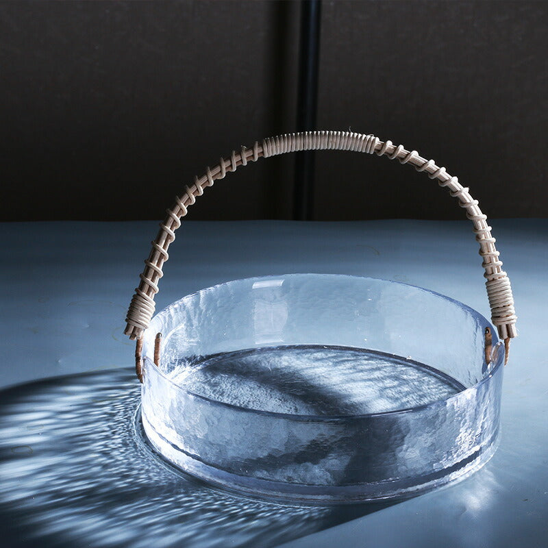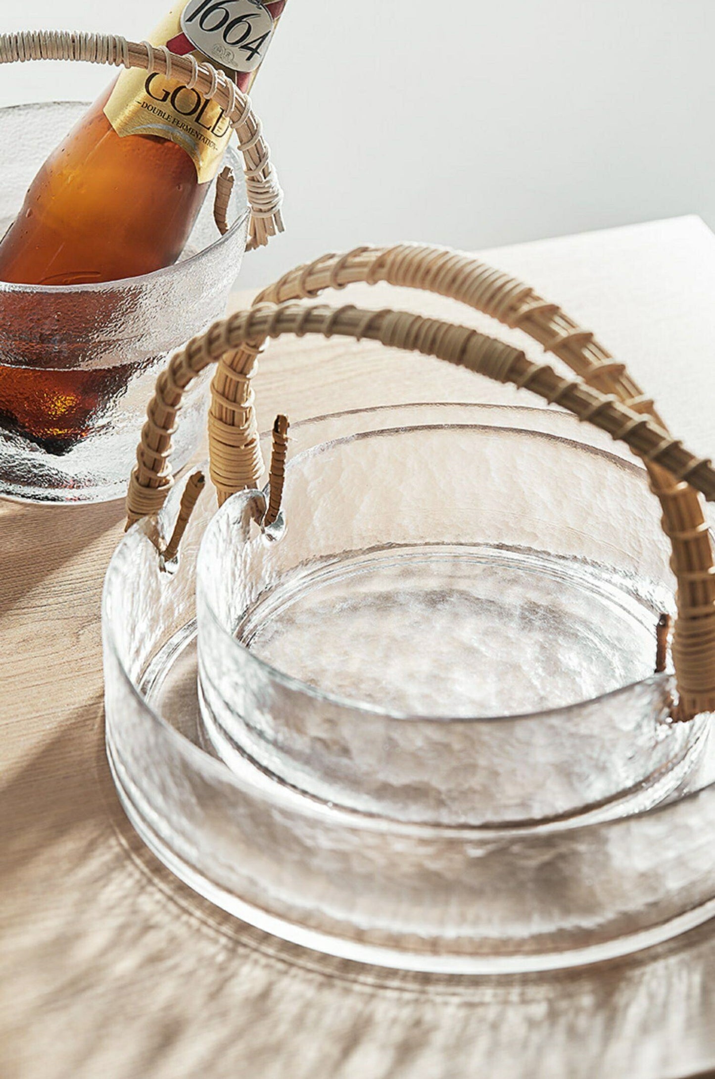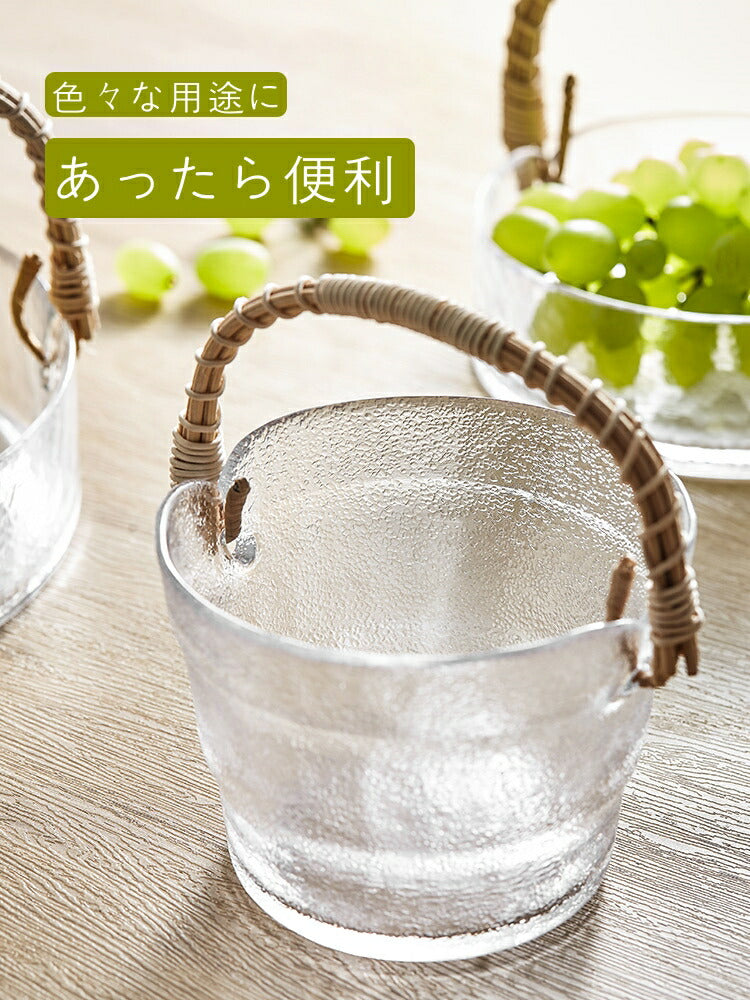 IwaiLoft 藤の持ち手 ガラスの盛り鉢 盛器 ラス盛り鉢 洋食器 ガラス 大鉢 大皿 盛鉢 手付かご ガラス鉢 桶型 ワインクーラー 冷酒クーラー アイスペール 硝子 平皿 菓子鉢 ガラスの器 そうめん ボウル 鉢 そうめん鉢 大鉢 めん鉢 ひやむぎ 深鉢 ガラスボウル 冷麺鉢