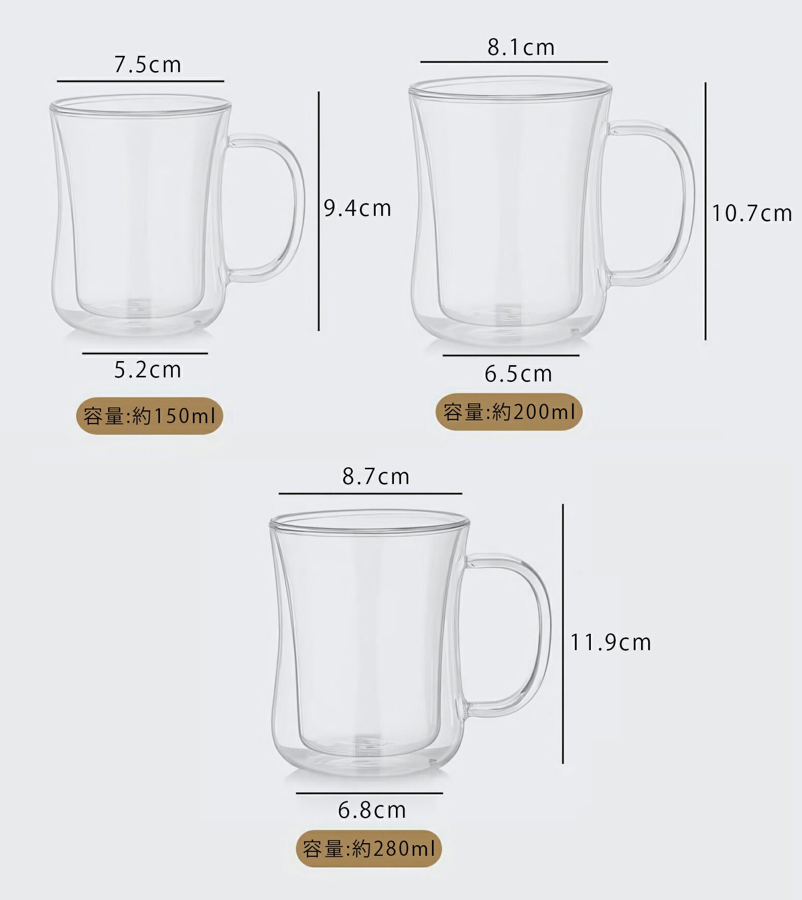 耐熱グラス 耐熱マグ ガラスコーヒーカップお家カフェ気分。150ml、200ml、280ml