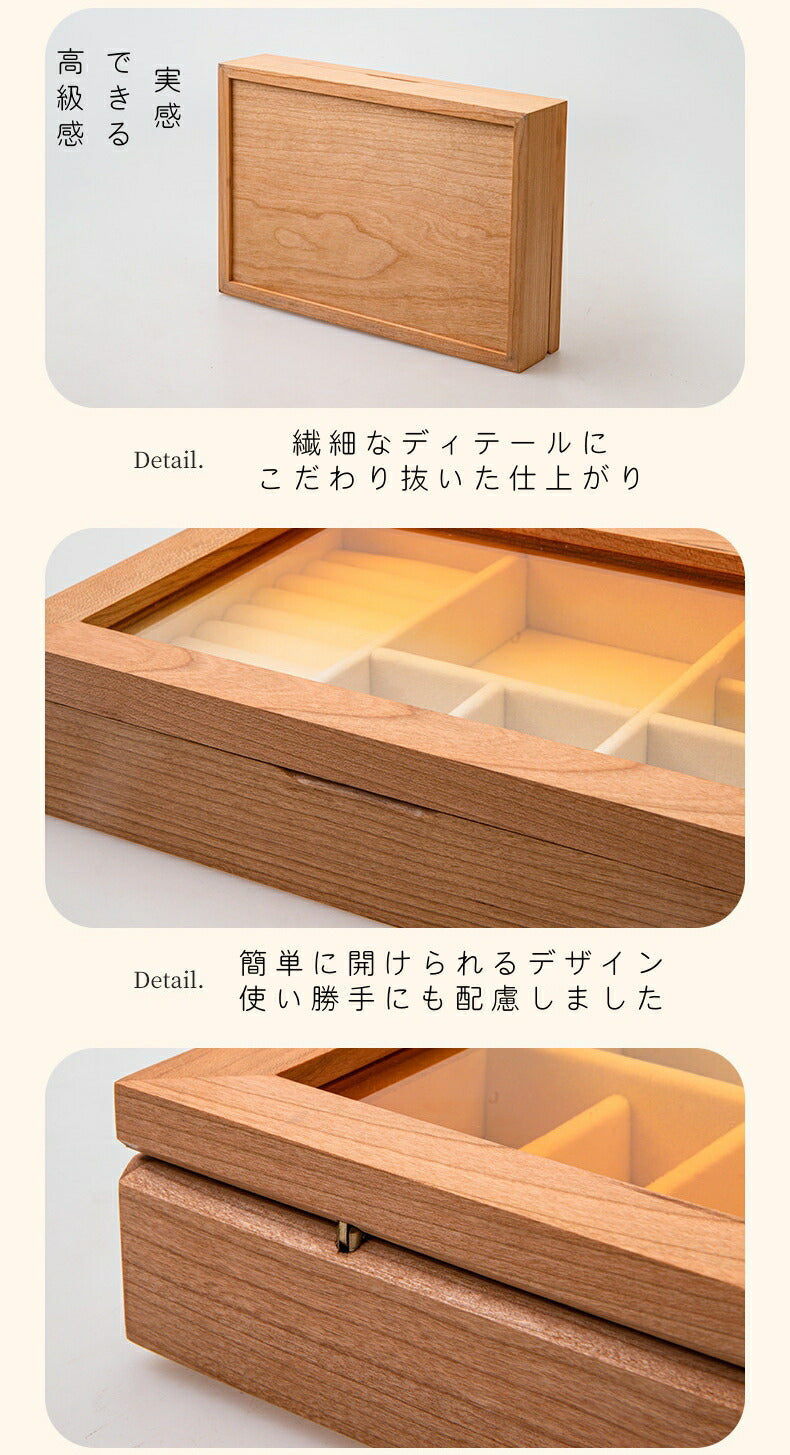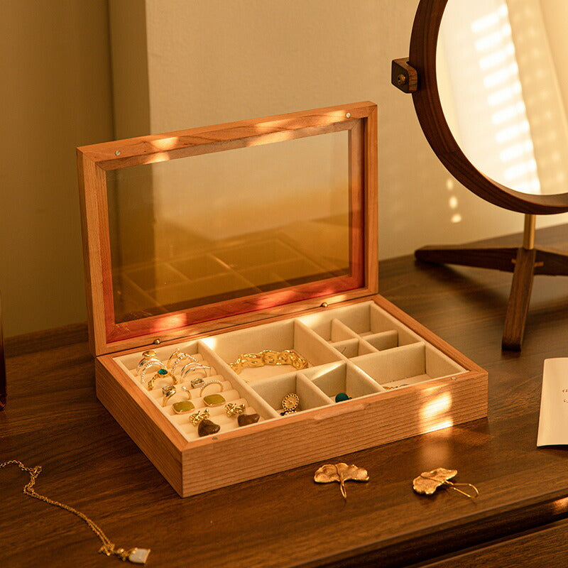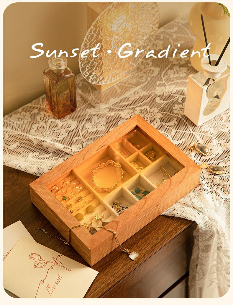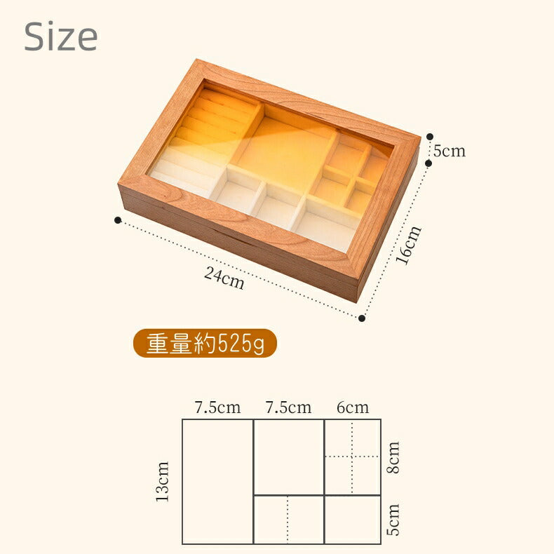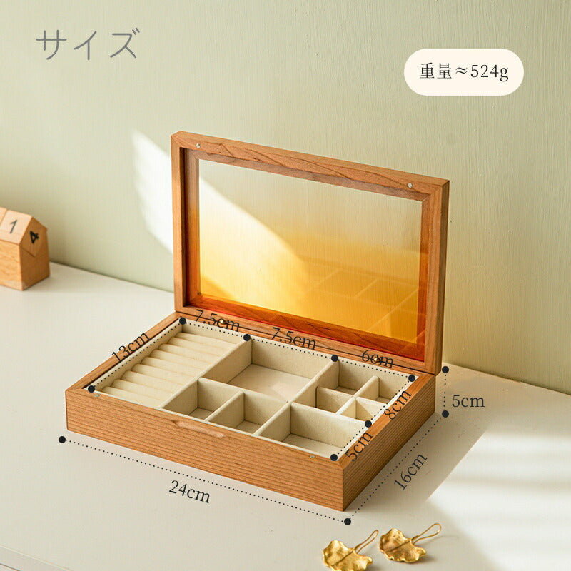 IwaiLoft 夕焼けに染まる絶景を眺める ジュエリーボックス アクセサリーケース 大容量 仕切り調整 1段 木製 波模様 サクラ木材 ビッチウッド ガラス ウッドケース おしゃれ 高級 宝石箱アクセサリー 収納 ケース 指輪 リング/ピアス/ネックレス/メガネ/時計収納 小物収納