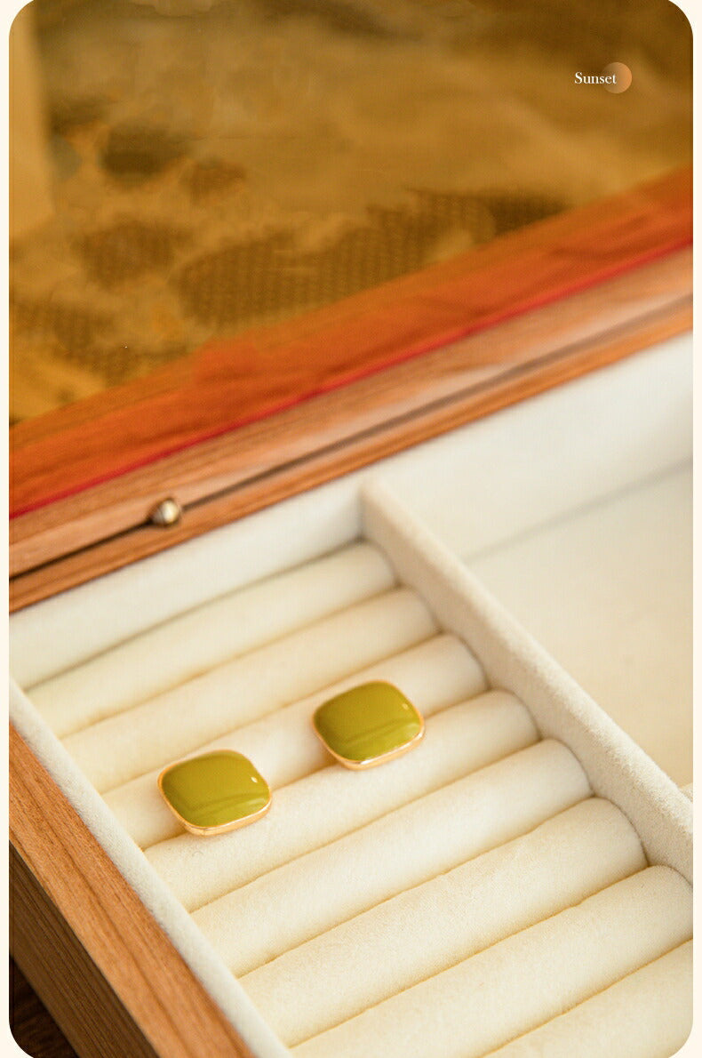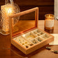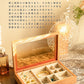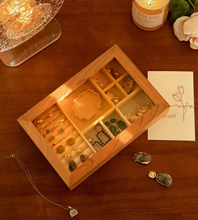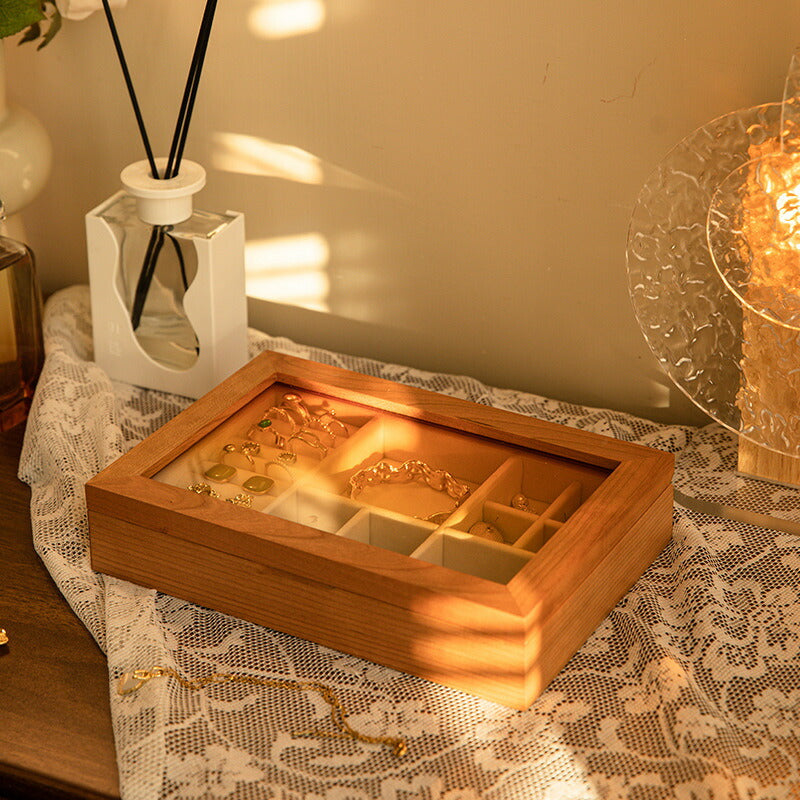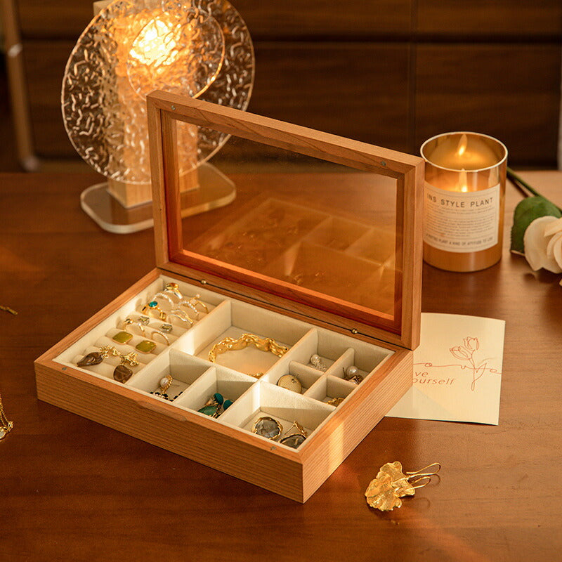 IwaiLoft 夕焼けに染まる絶景を眺める ジュエリーボックス アクセサリーケース 大容量 仕切り調整 1段 木製 波模様 サクラ木材 ビッチウッド ガラス ウッドケース おしゃれ 高級 宝石箱アクセサリー 収納 ケース 指輪 リング/ピアス/ネックレス/メガネ/時計収納 小物収納