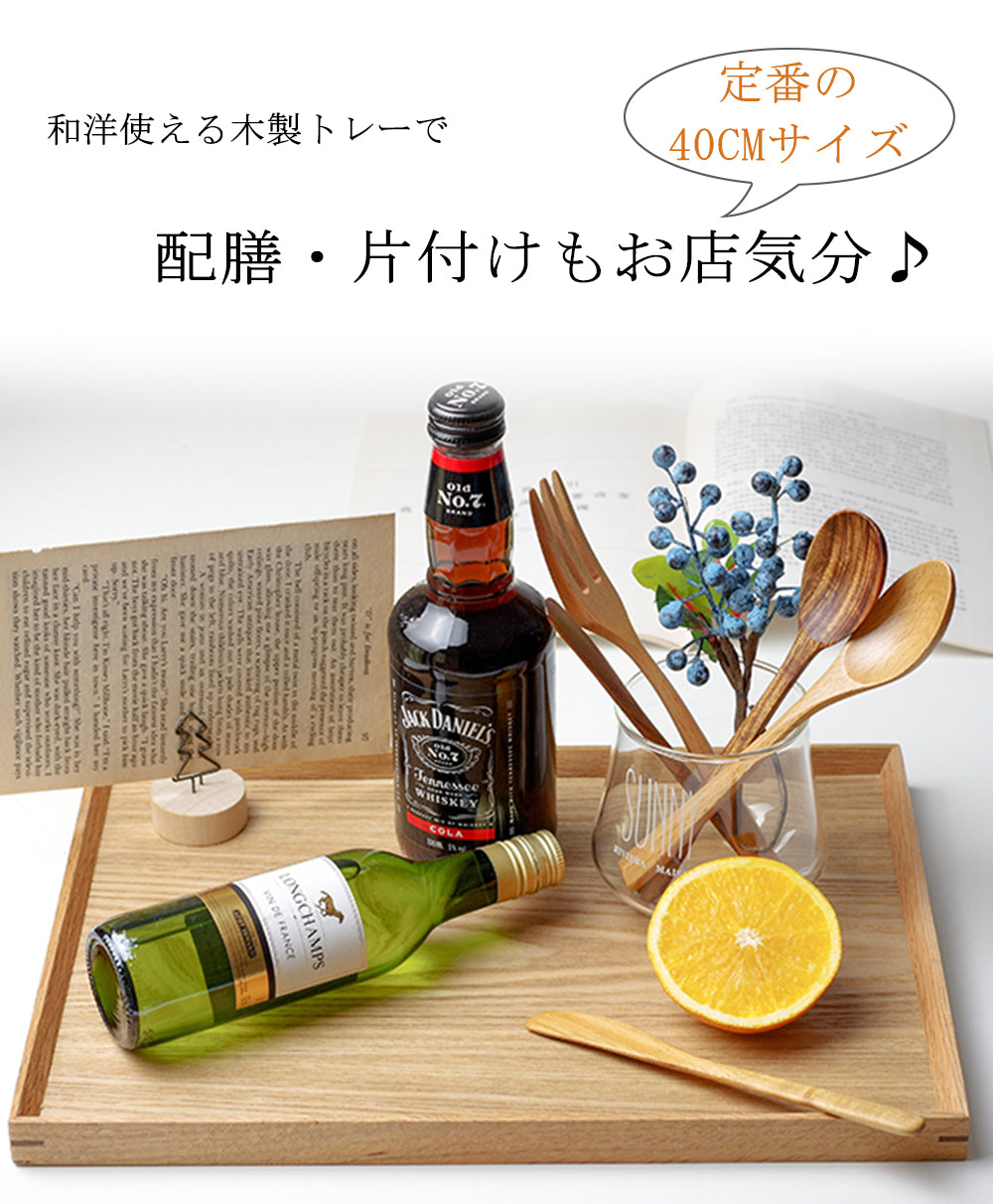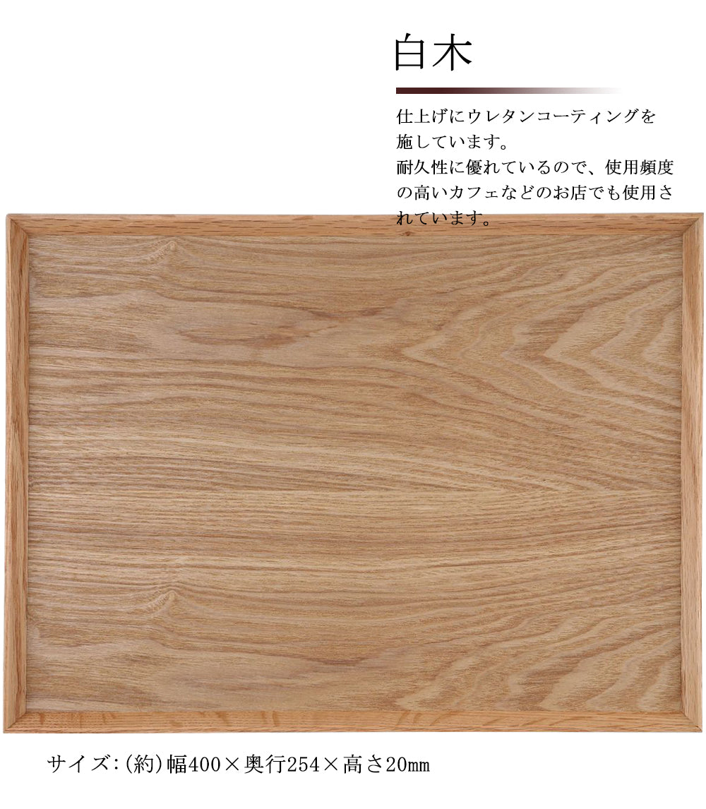 ◆おしゃれなカフェ風、木製のトレー天然木を使用した、【羽反(はぞり)】【ナチュラル】仕上げの長角膳です。底板は6mmの肉厚の板を使用しており、またウレタン塗装で仕上げているため丈夫でしっかりしています。食卓を気軽にカフェの雰囲気に演出でき、お料理もおいしそうに、おしゃれなテイストに早変わり。◆羽反りタイプなので枠の立ち上がりは斜めです立ち上がりを羽反(斜め)に加工し、またシャープにカットすることでスタイリッシュなデザインに仕上げました。ランチョンマットとしてでも、フチがあるのでお盆としての利用もOKです。フチに角度がついているため持ち運びもしやすくなっています。◆素材・サイズ素材/天然木、ウレタン塗サイズ/約 40×25.4×2cm重量/約650g前後(木製のため一枚ずつ重さが違います)◆木製でもお手入れはとても簡単です木製品ですので、水がしみ込んだりする恐れがあります。プラスチック製とは異なり完全防水ではありませんので、普段は湿らせた布巾などで拭いてお手入れください。汚れがひどい時は、洗剤などを含ませた布巾などで先に拭いていただくのが良いです。お店など業務用にもおすすめです。◆天然木ならではの木の表情毎回表情が違うのが、天然木商品のたのしみです。お盆一枚一枚表情が違いますが、どのお盆も表情豊かに魅せてくれてます。その豊かな表情こそが天然木の良さであります。天然の木を使用しているため、底板の部分の杢目の出方や色合いは相違がみられます。また、同じように枠の木の部分にも もともとの自然の杢目(色の濃い杢目や黒い杢目など)が入る場合があります。★ナチュラル仕上げの場合、スリうるしや仕上げや黒スリうるし仕上げとは違い 素材そのままの杢目が出てきます。元来、天然木にはいろんな杢目が入るのが自然の状態です。(ご使用には何ら問題ございません)杢目の指定や、到着後の(杢目による)交換はお受けできませんのでご理解お願いいたします。お祝い事に…新生活・結婚祝い・出産祝い・お誕生日・開業祝い・引っ越し祝い・敬老の日など