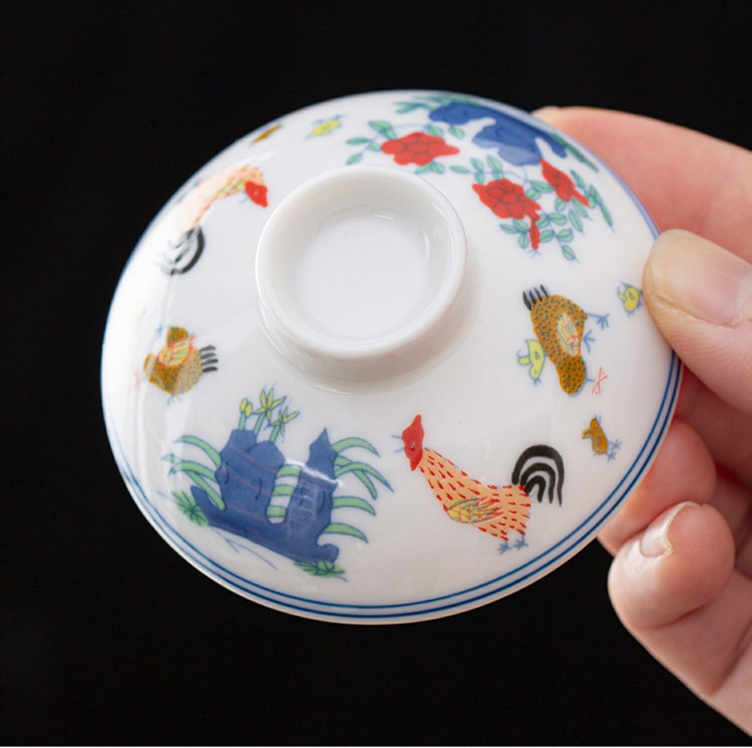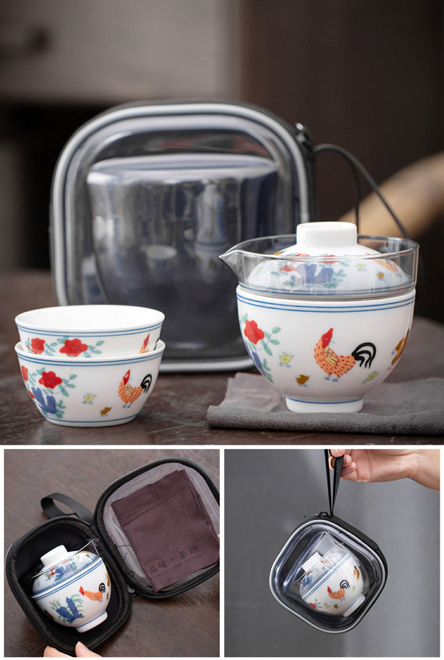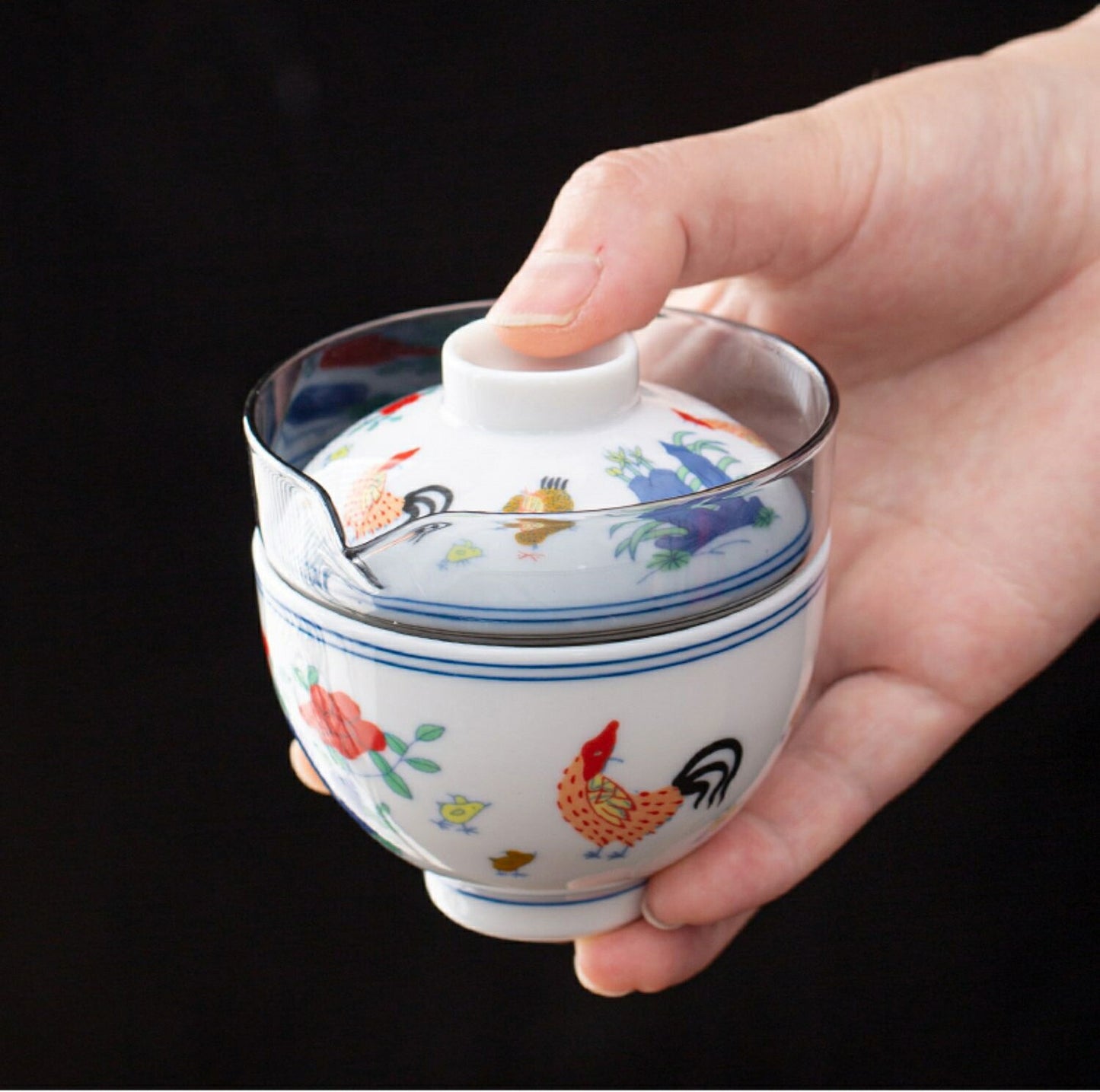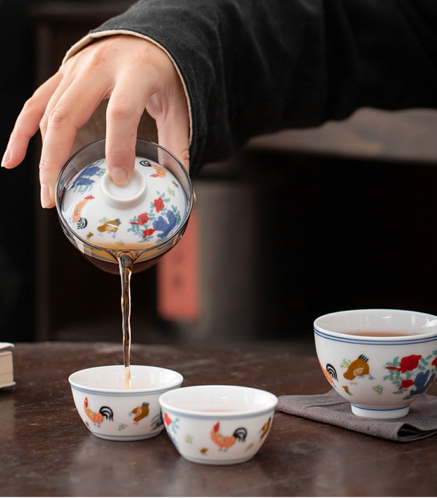 IwaiLoft 鶏 2客 茶器セット 宝瓶 蓋碗 ガラス サーバー 湯冷まし 品茗杯 茶杯 湯吞み 小 白磁 茶器 磁器 ホワイト 白い食器 ティーポット セット ティーカップ 中国茶器 明成化闘彩鶏缸杯 台湾茶器 旅用 アウトドア 父の日 母の日 プレゼント
