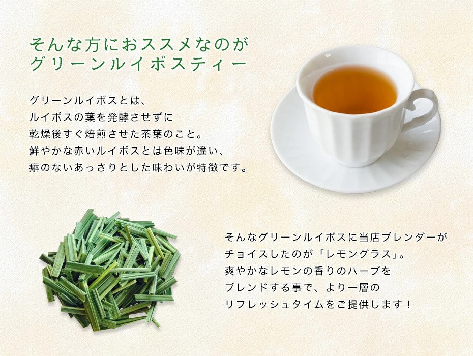 ふくちゃこだわりのグリーンルイボスにレモングラスをブレンド! グリーンルイボスの癖のないあっさりとした味わいとレモングラスの爽やかな香りが 特徴的な飲みやすいブレンドティーです。 仕事や家事で疲れた時、グリーンルイボスレモングラスミックスで清々しいリフレッシュタイムを過ごしませんか?