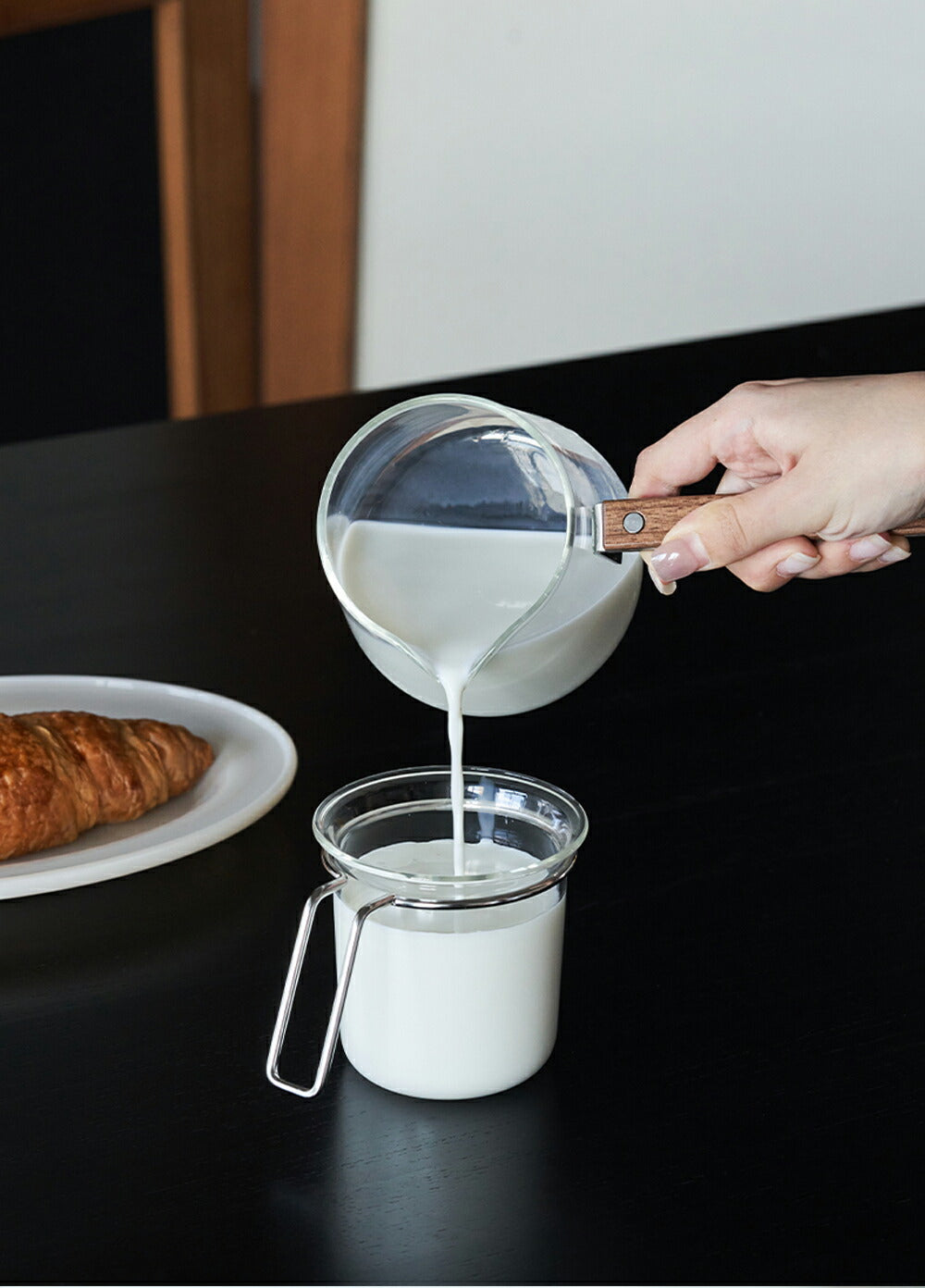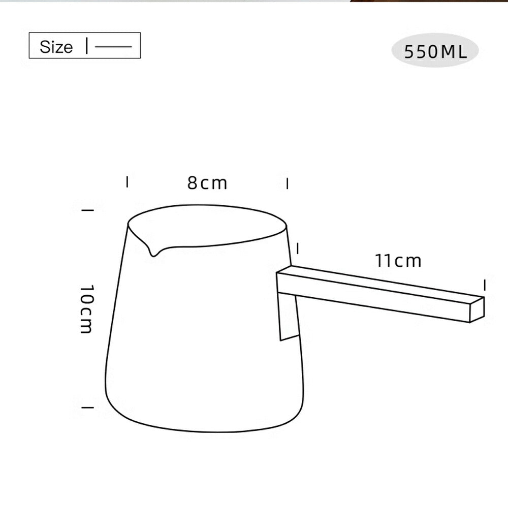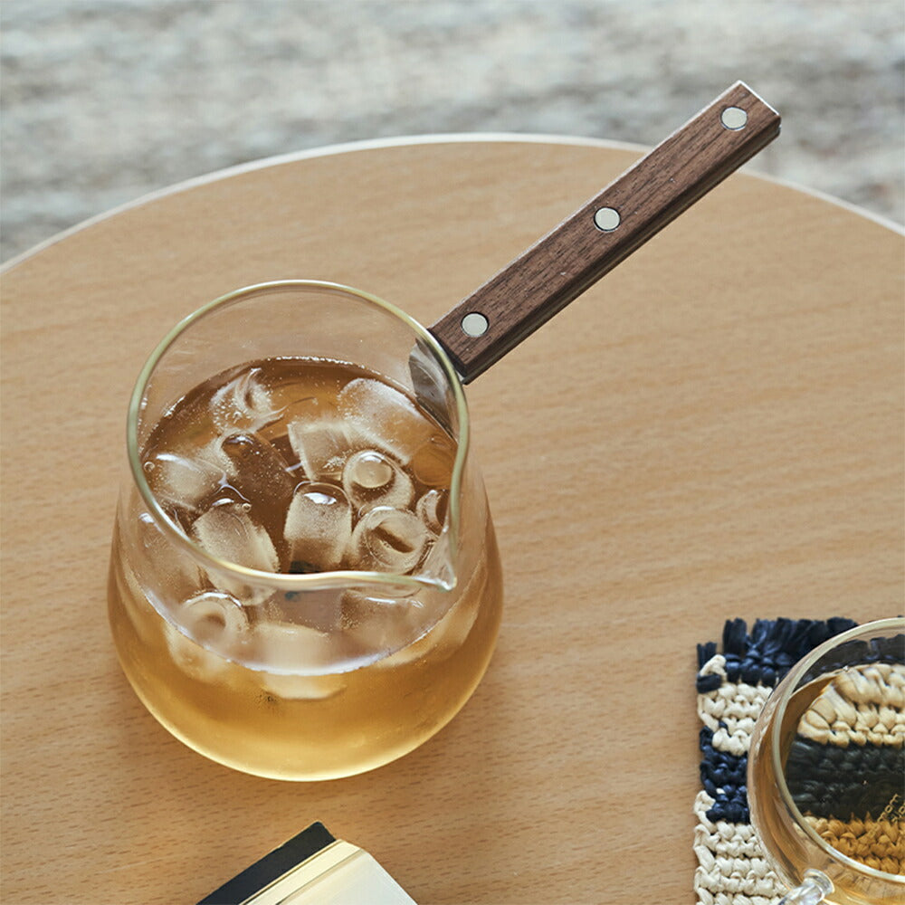 一目瞭然・直火可 耐熱ガラス ガラスポット ミルクピッチャー 小 ティーポット コーヒーサーバー コーヒーポット 横手 片手鍋 ガラス鍋 ミルクパン ガラス ソースパン 小鉢 ミニパン V字型注ぎ口 550ml ガラス調理鍋 ガラス食器 木製ハンドル 食洗機対応 IwaiLoft
