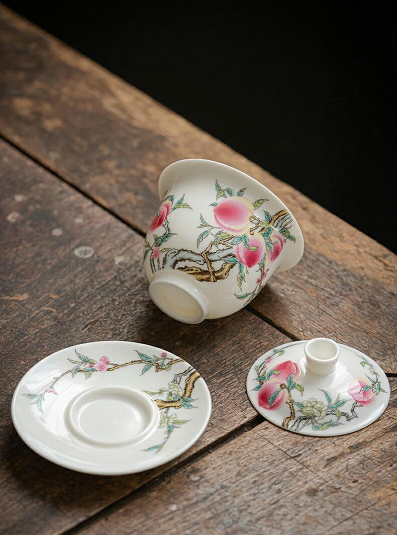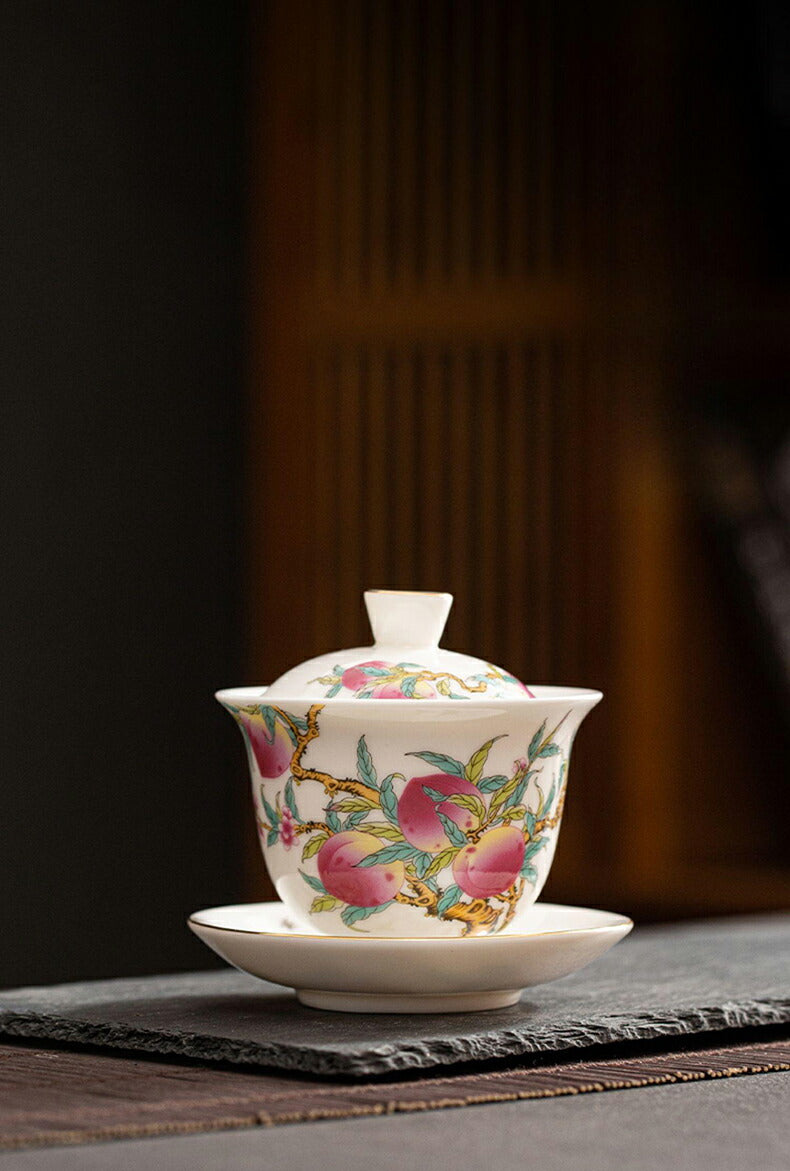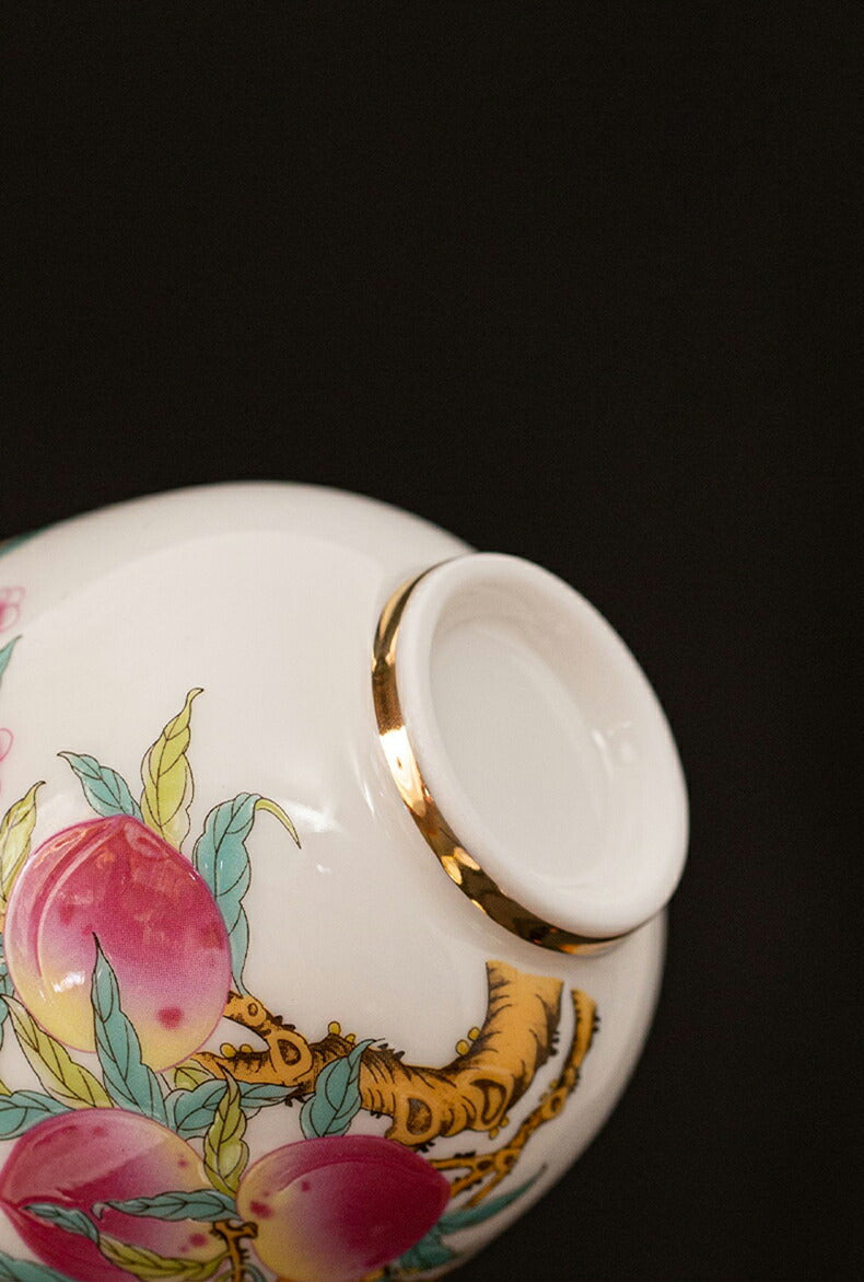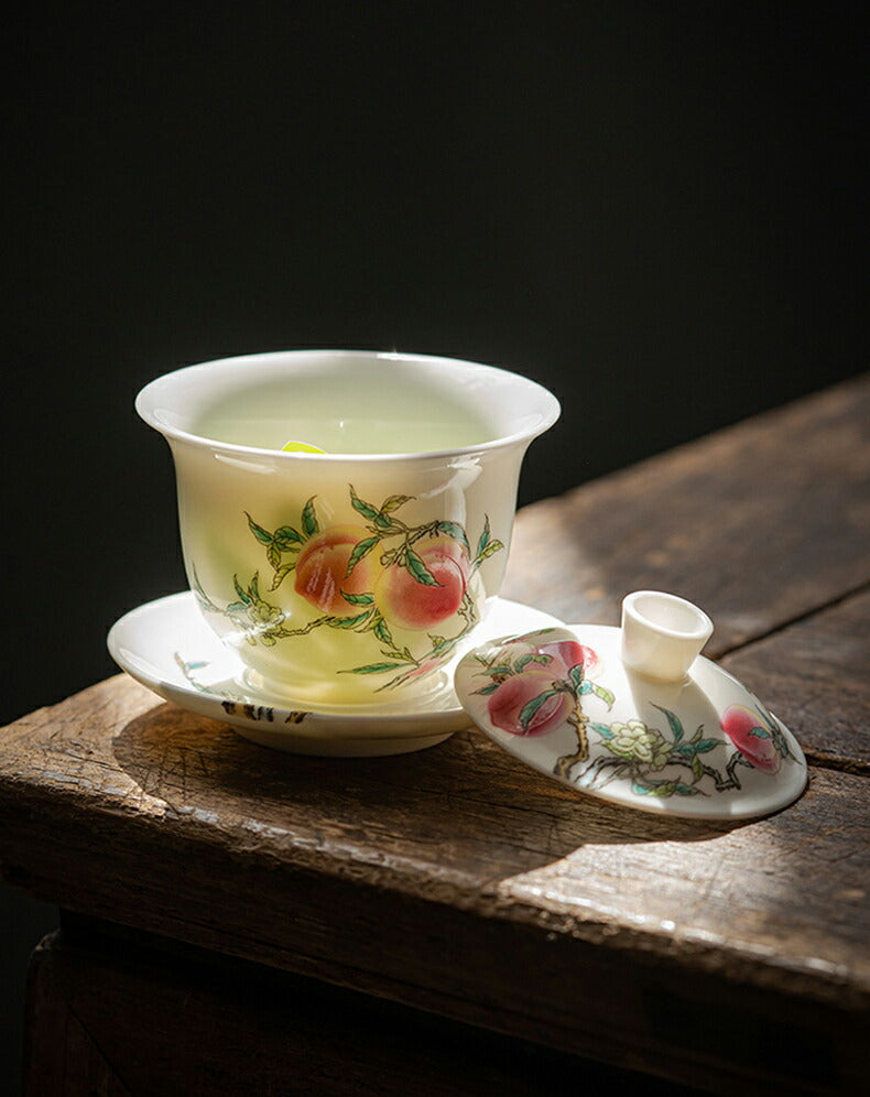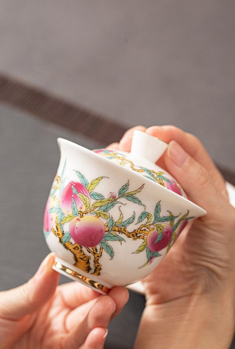 「九桃」みずみずしい桃の絵柄 蓋物 スープ椀 スープボウル 蓋付 グラス 菓子椀 ボウル 茶碗 宝瓶 フリーカップ お碗 珍味入れ 宝瓶 抹茶茶碗 茶碗蒸し 蓋碗 茶器 手作り 中国茶器 景徳鎮 茶芸 父の日 プレゼント 母の日 ギフト IwaiLoft
