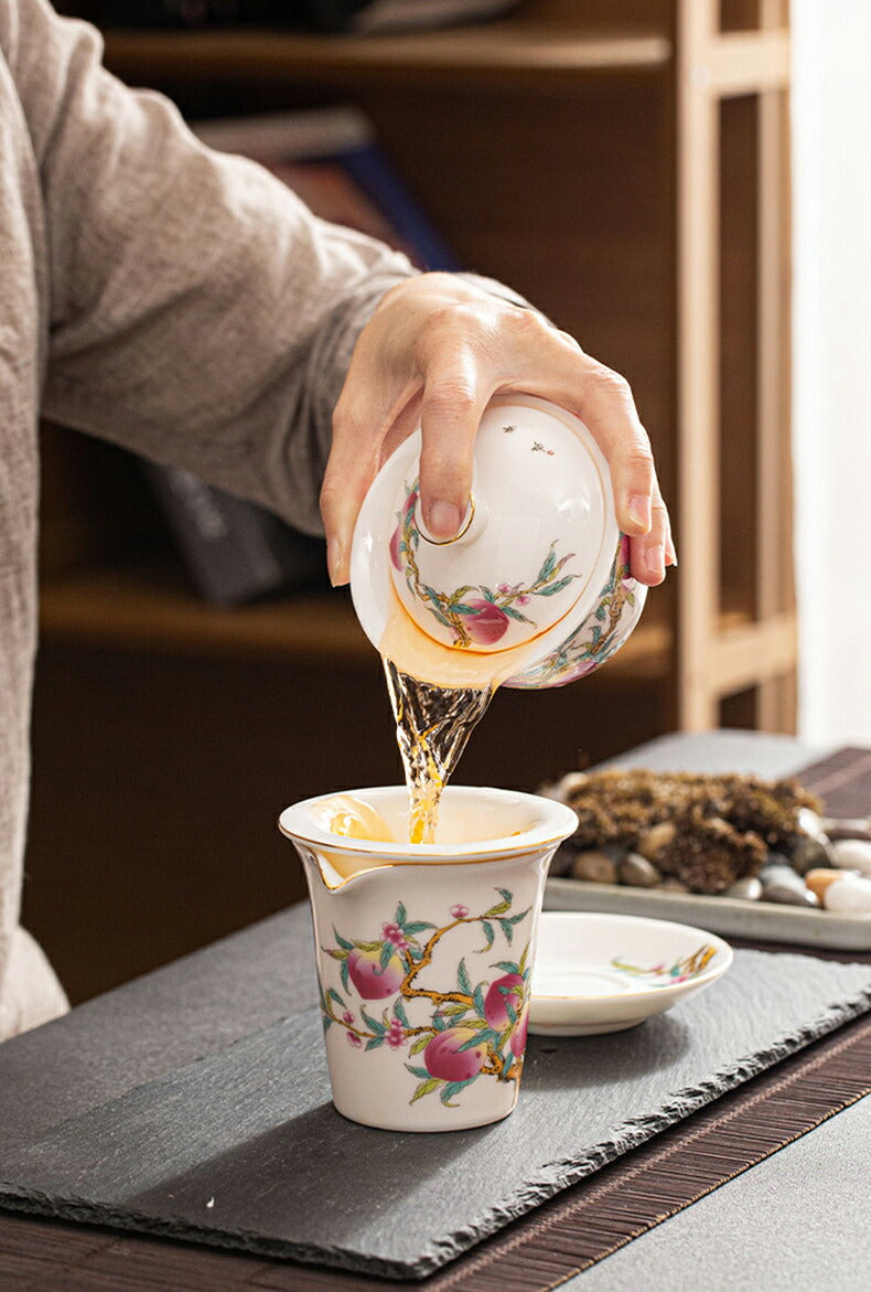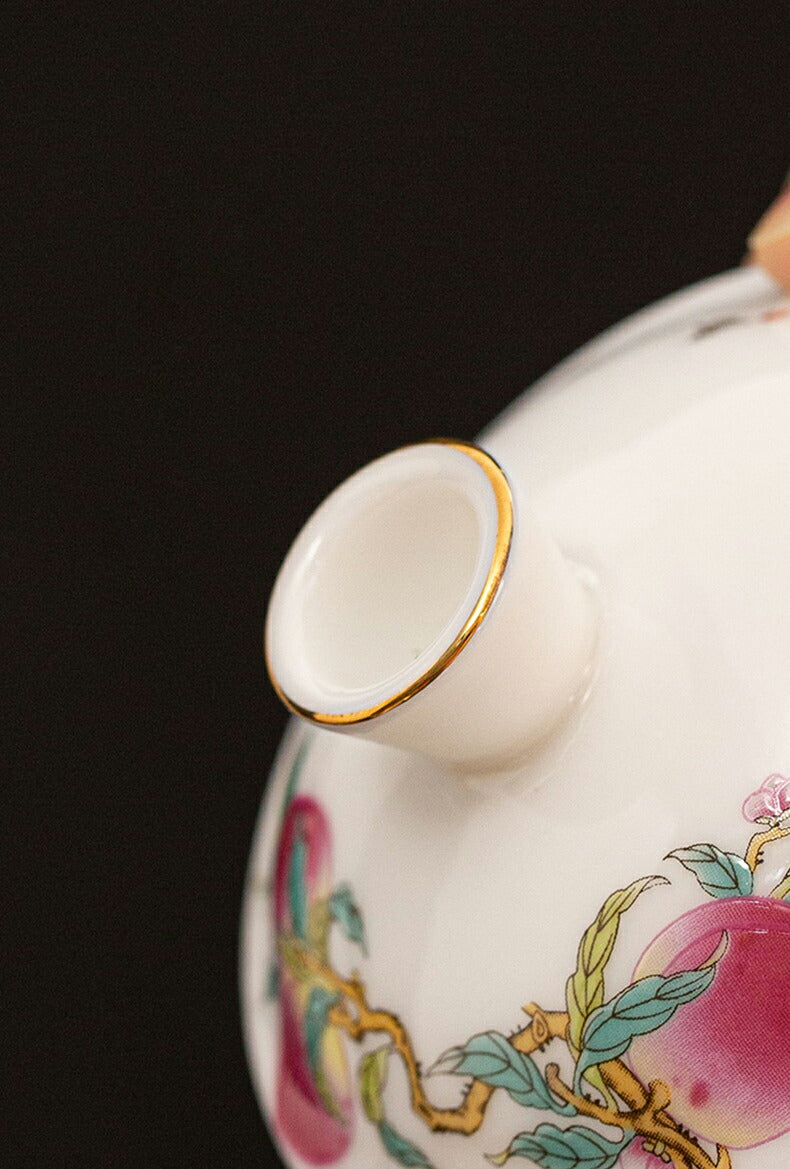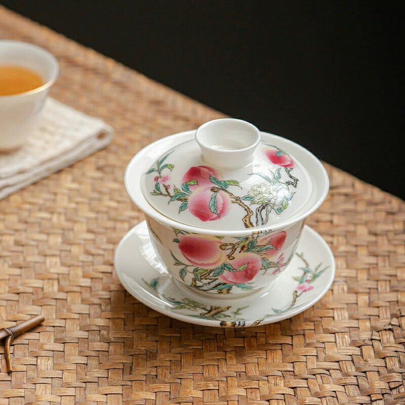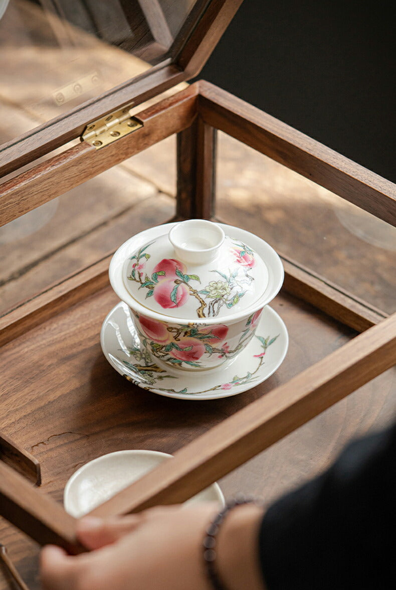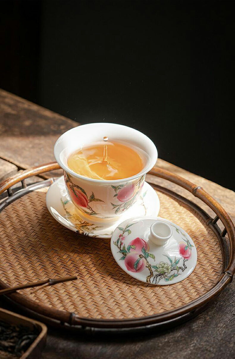 「九桃」みずみずしい桃の絵柄 蓋物 スープ椀 スープボウル 蓋付 グラス 菓子椀 ボウル 茶碗 宝瓶 フリーカップ お碗 珍味入れ 宝瓶 抹茶茶碗 茶碗蒸し 蓋碗 茶器 手作り 中国茶器 景徳鎮 茶芸 父の日 プレゼント 母の日 ギフト IwaiLoft