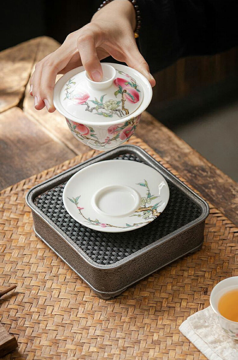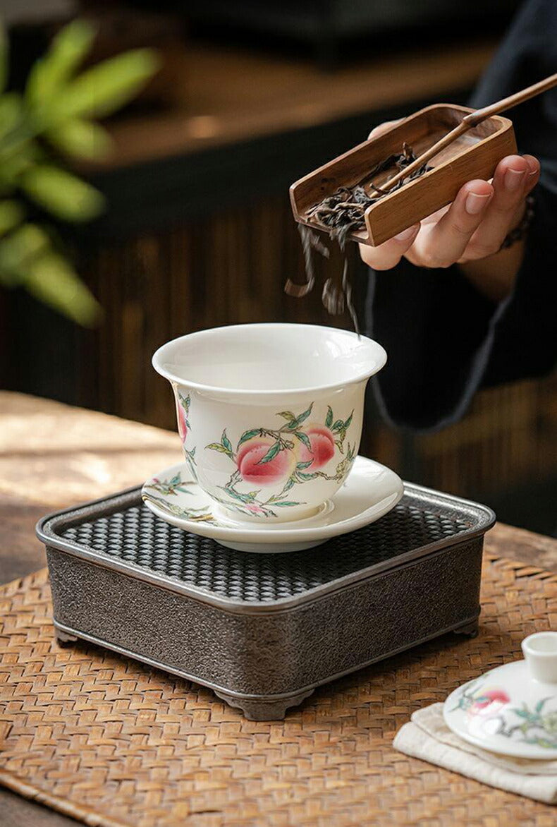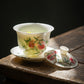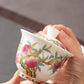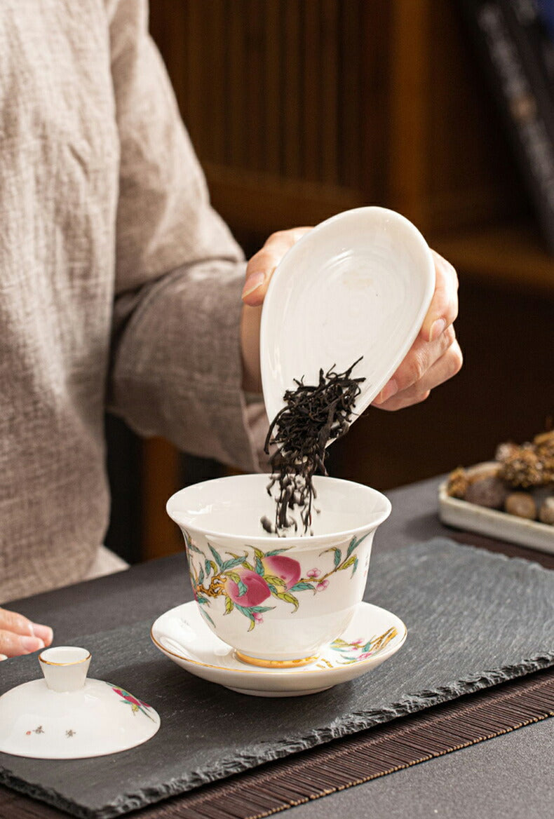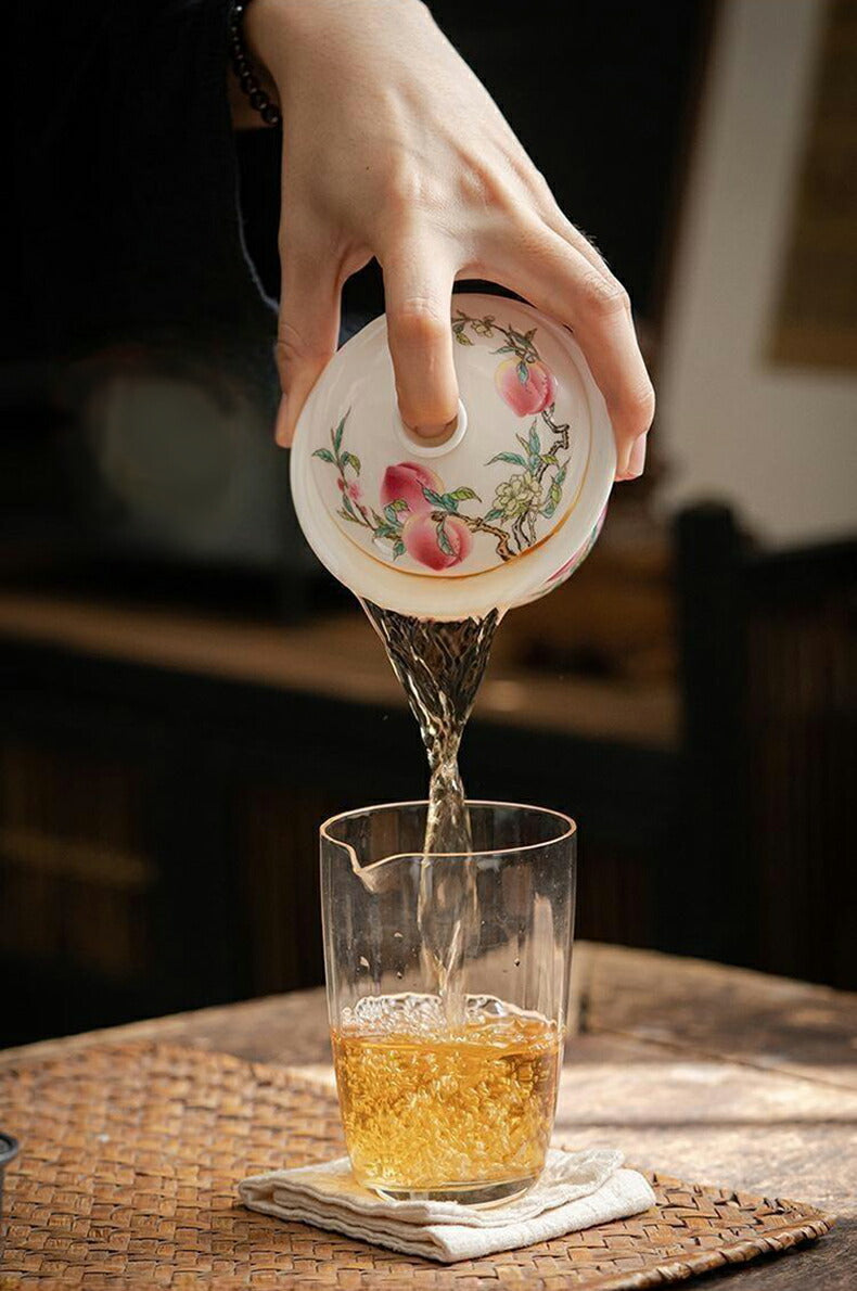 「九桃」みずみずしい桃の絵柄 蓋物 スープ椀 スープボウル 蓋付 グラス 菓子椀 ボウル 茶碗 宝瓶 フリーカップ お碗 珍味入れ 宝瓶 抹茶茶碗 茶碗蒸し 蓋碗 茶器 手作り 中国茶器 景徳鎮 茶芸 父の日 プレゼント 母の日 ギフト IwaiLoft