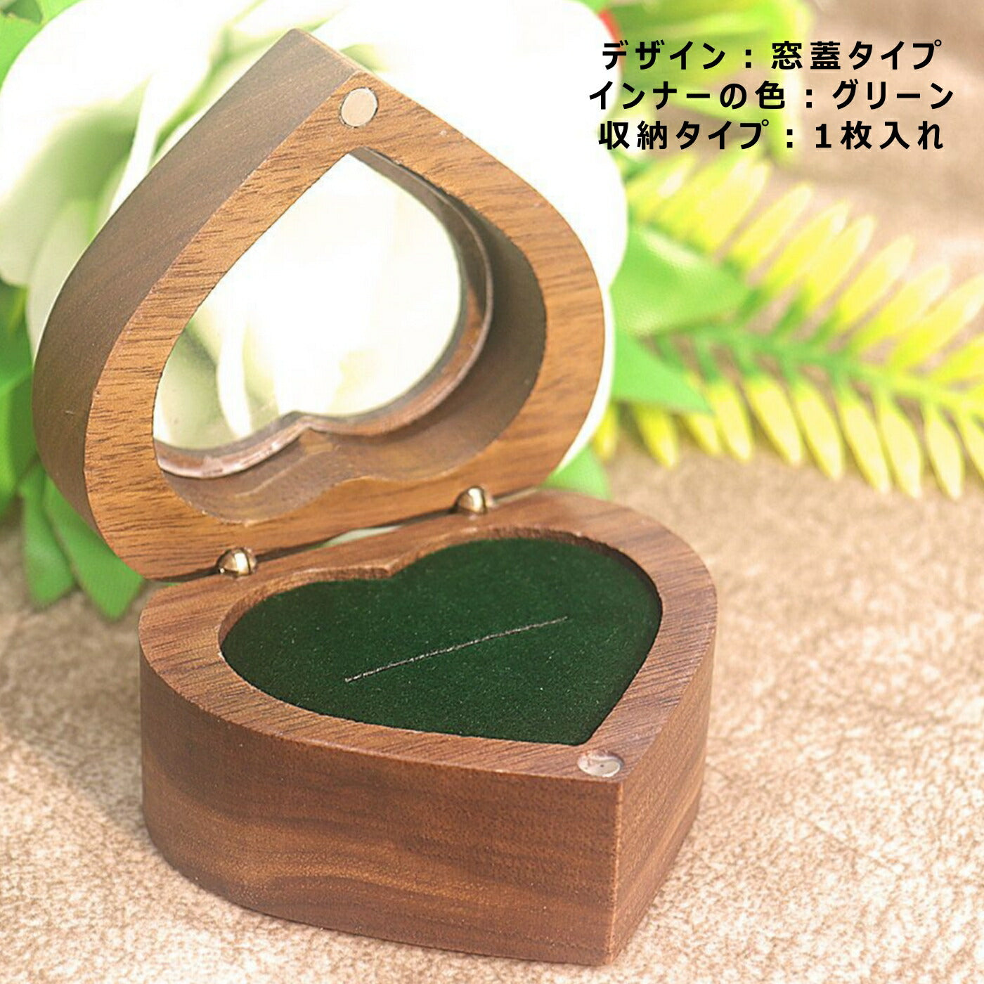 外出時や旅行にも最適なこのリングケースは、持ち運びに便利なサイズで、どこへでも気軽に持って行けます。内部は柔らかい素材で覆われており、大切なリングを傷から守ります。また、蓋の内側には鏡が付いており、リングをはめる際に便利です。