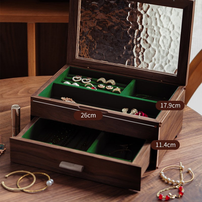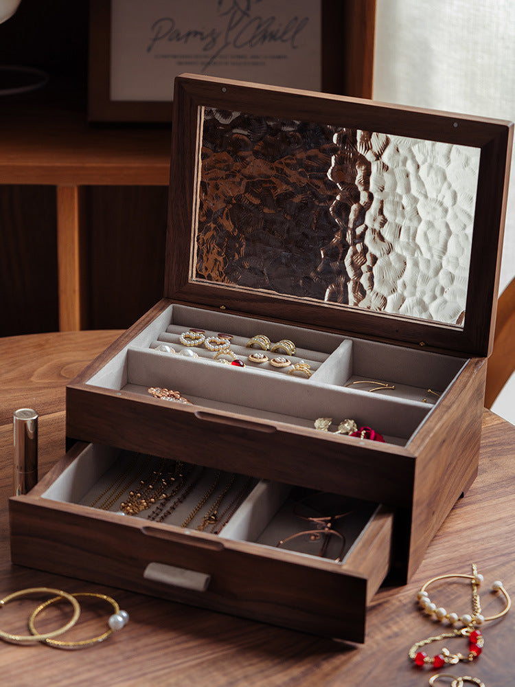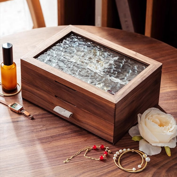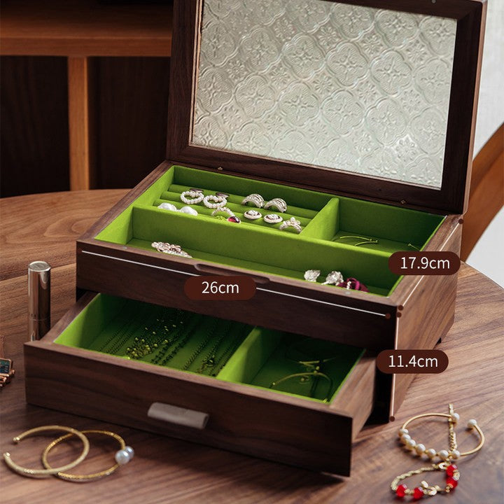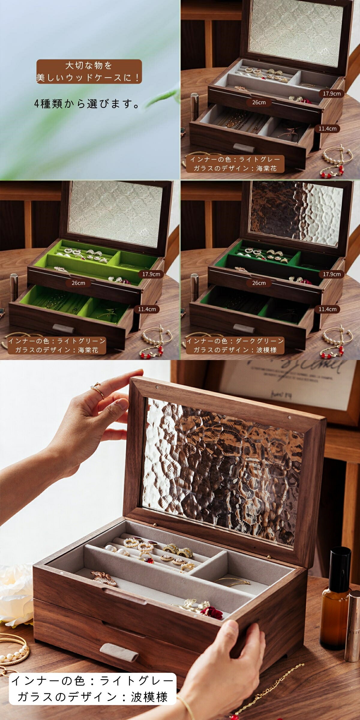 大切な物を美しいウッドケースに!ジュエリーボックス アクセサリーケース 大容量 仕切り調整 2段 木製 ウールナット ガラス ウッドケース おしゃれ 高級 宝石箱アクセサリー 収納 ケース 指輪 リング/ピアス/ネックレス/メガネ/時計収納 小物収納 玄関 IwaiLoft