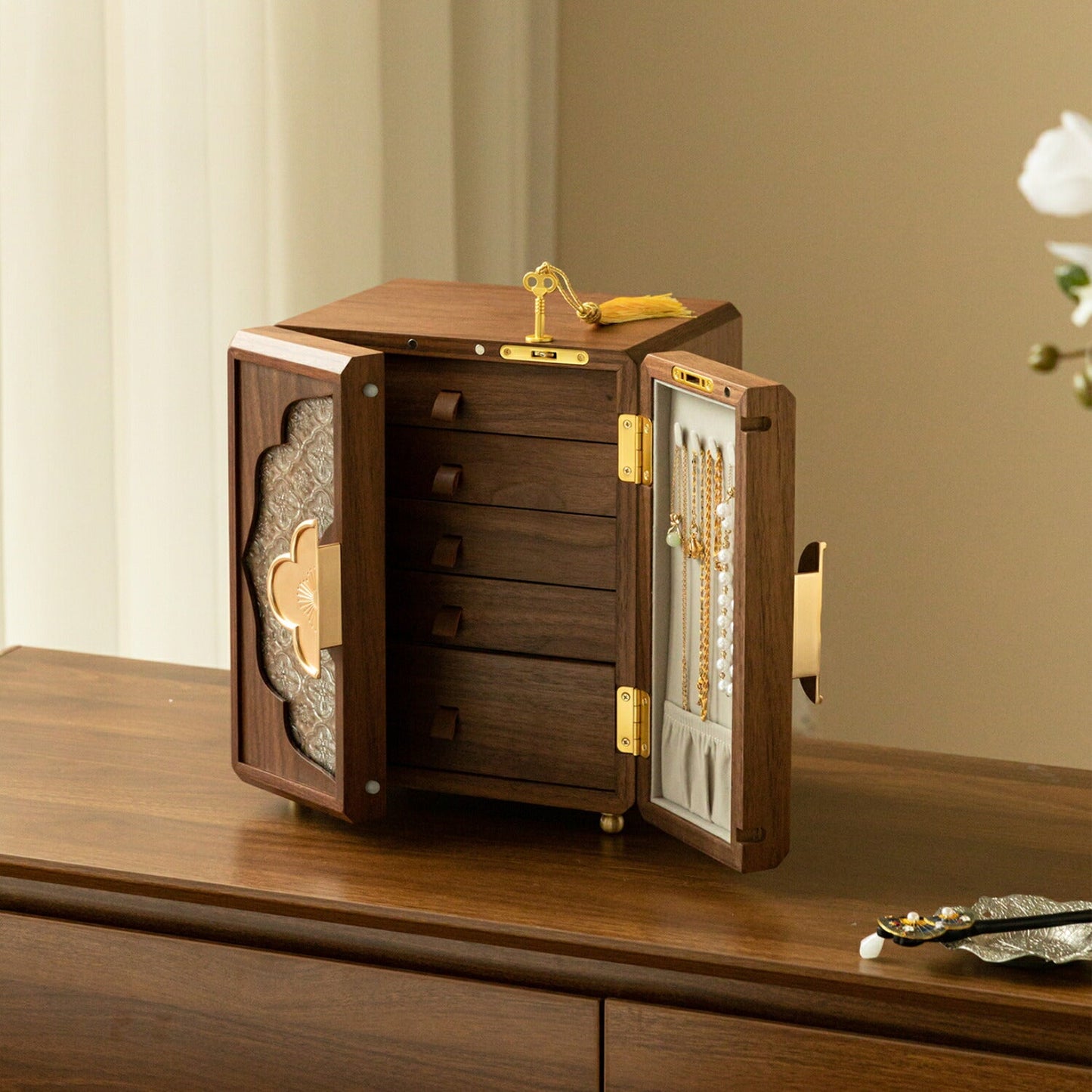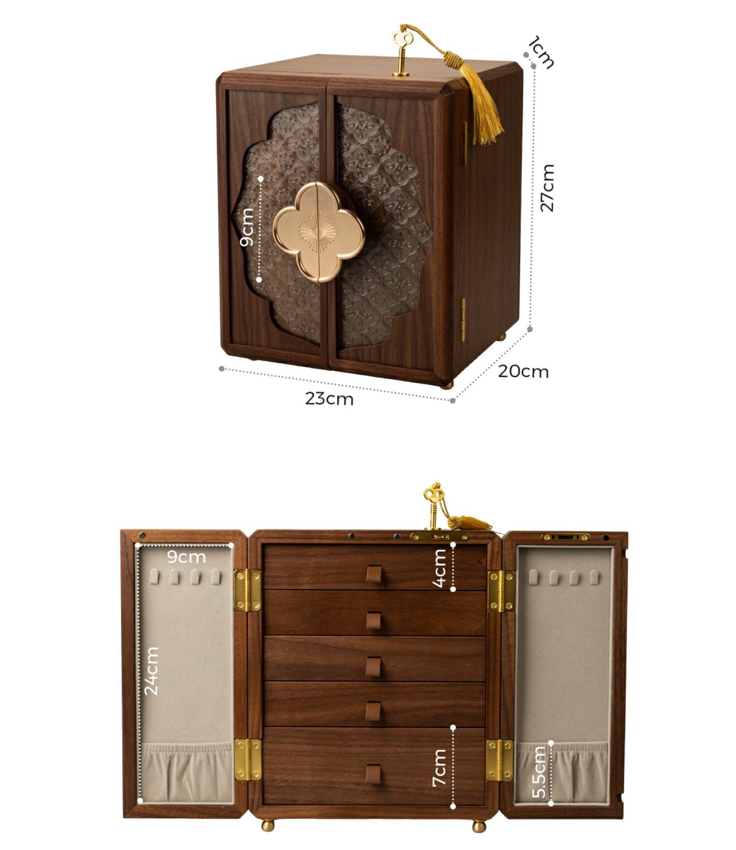 鍵付き ジュエリーボックス アクセサリーケース 木製 フローラガラス 仕切り 5段 大容量 ウールナット 窓付き ウォッチボックス 時計ケース ウォッチケース 2本 腕時計収納 ウッドケース ロック機能 宝石箱 指輪 リング ピアス ネックレス メガネ 母の日 プレゼント IwaiLoft