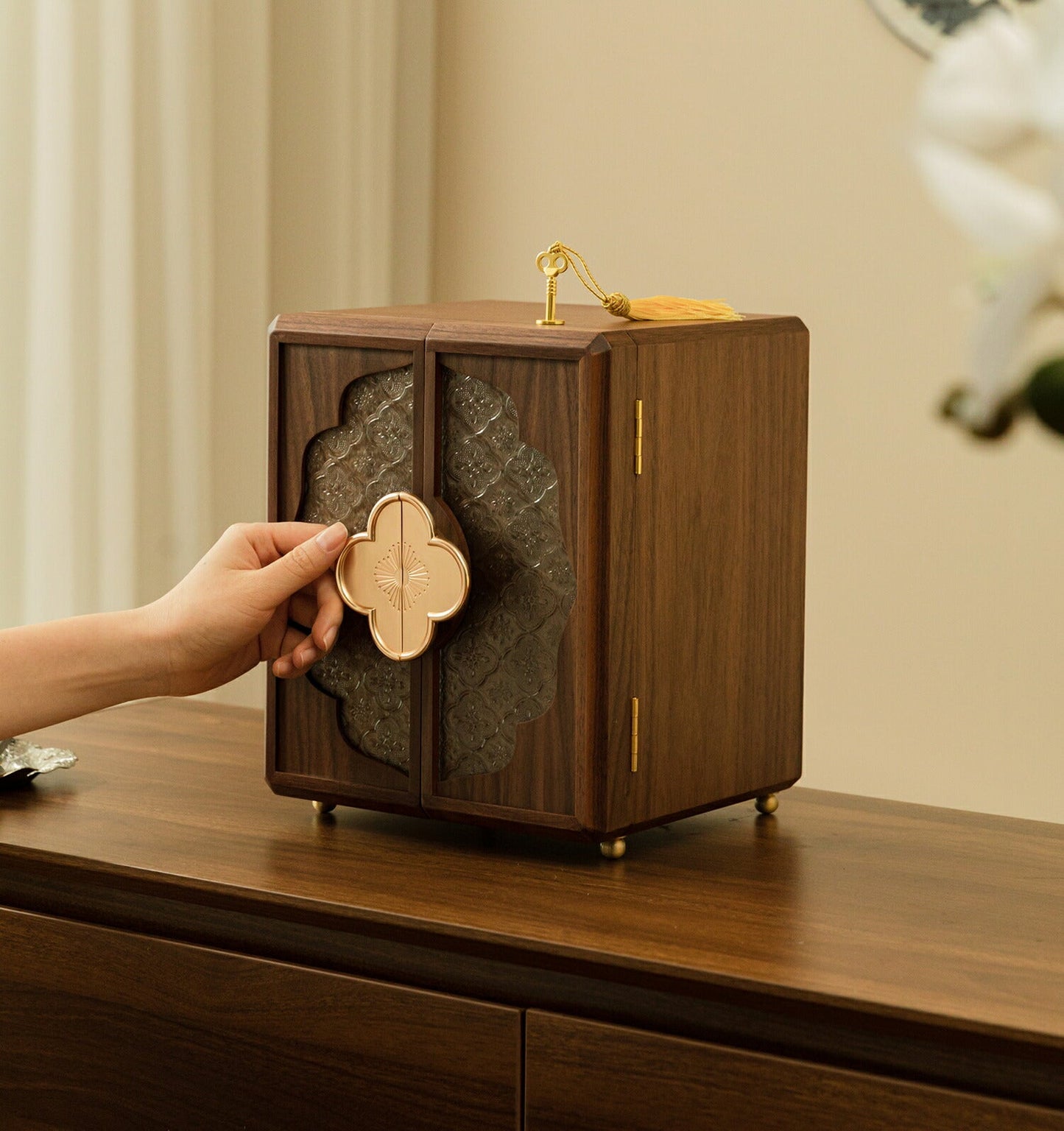 銘木のウールナットのジュエリーボックスは、洗練されたデザインと機能性を兼ね備えたアクセサリーケースです。高品質のウールナット材を使用し、その深みのある色合いがどんなインテリアにも上品な印象を与えます。透明なガラス窓は中身が一目でわかり、日々のアクセサリー選びをスムーズにします。