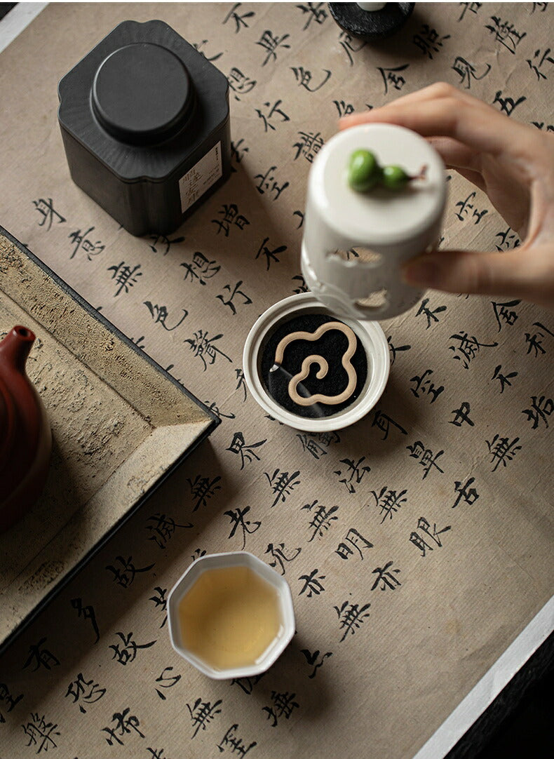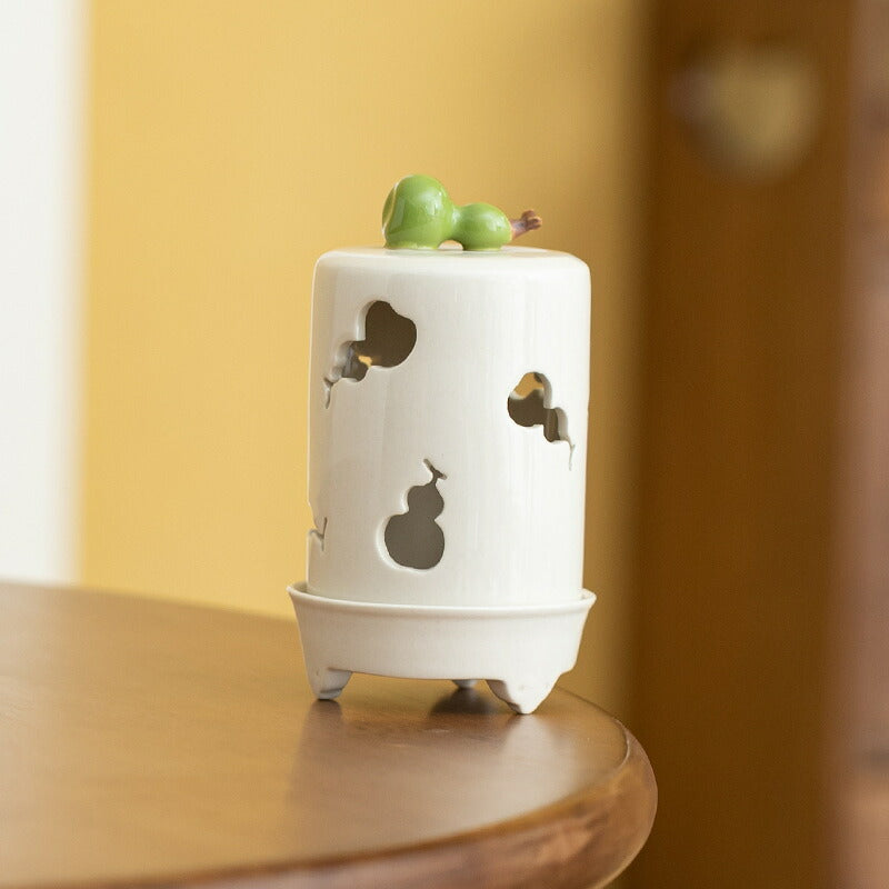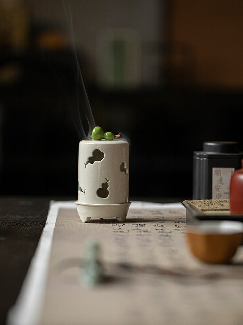 瓢箪は古来から縁起の良いモチーフとされており、この香炉を使用することで、幸運を呼び込むとされています。また、香炉の側面には魚の形をした透かし彫りが施されており、煙が美しく舞い上がる様子を楽しむことができます。このディテールは、視覚的にも楽しめる要素となっており、リラックスタイムの質を高めてくれるでしょう。