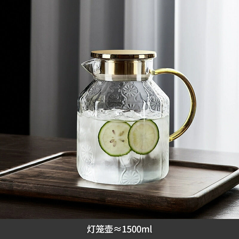 IwaiLoft レトロでかわいい 向日葵 冷水筒 耐熱ガラス スリムジャグ ガラスサーバー 花柄 ガラスポット ピッチャー 1500ml 大容量 木蓋 麦茶ポット お茶ポット 水ジャグ ウォーターピッチャー ウォーターカラフェ 小 透明 ジャグ 水差し ドリンクピッチャー ピクルスポット