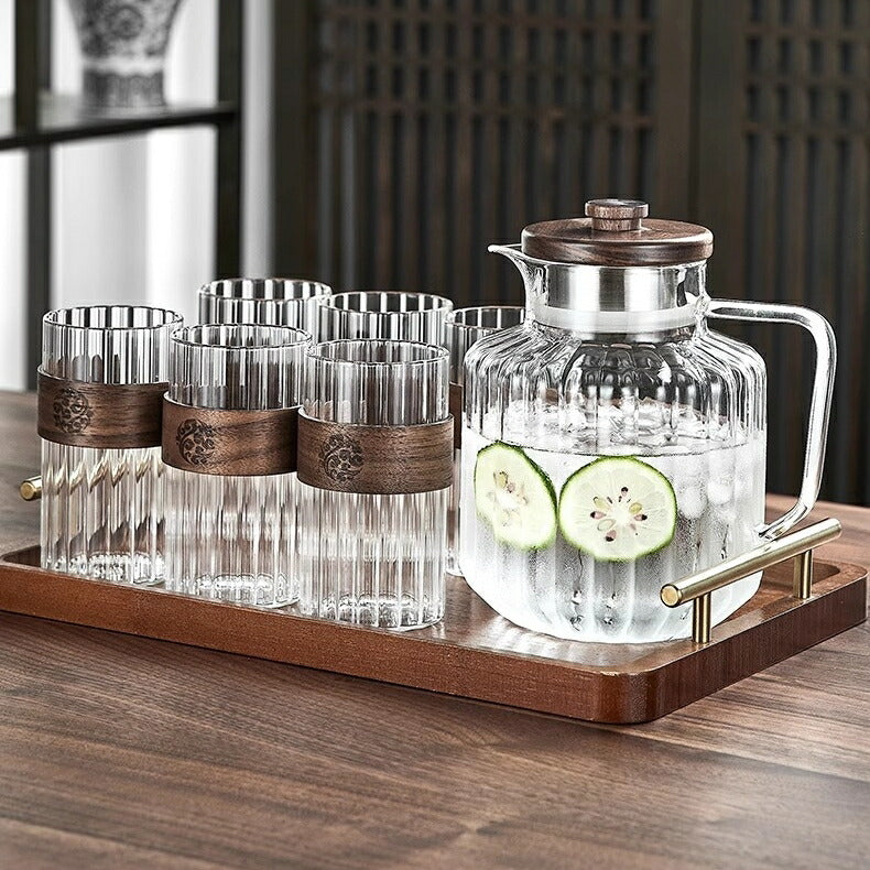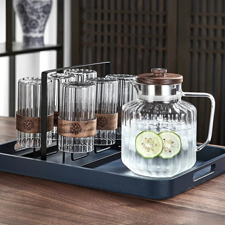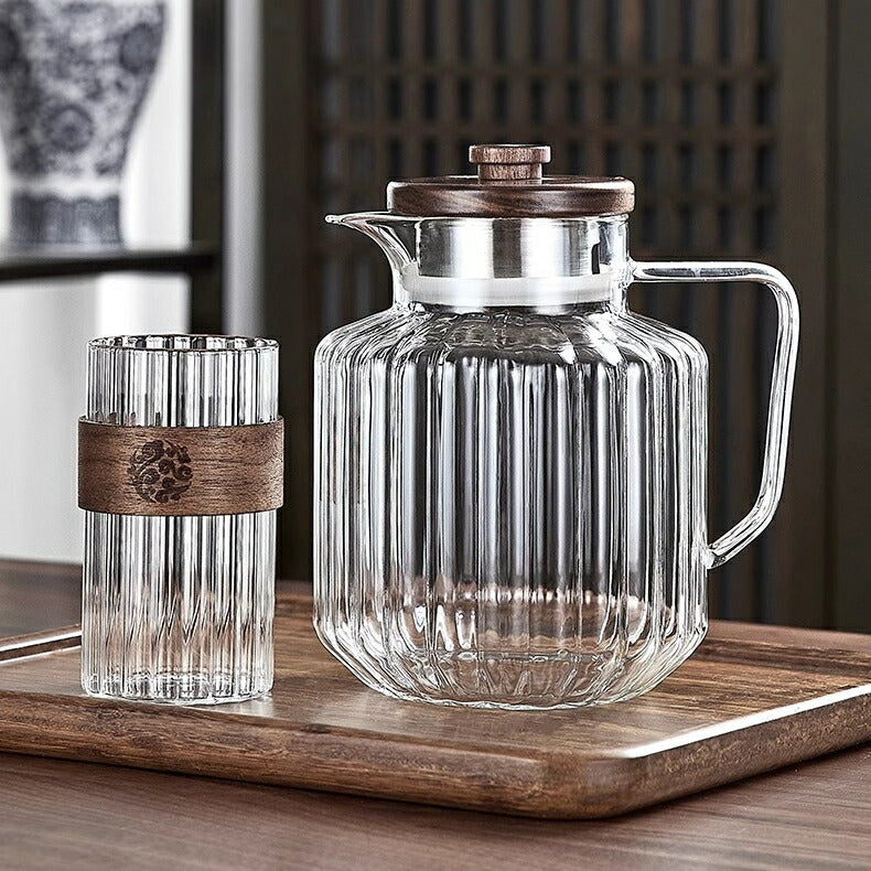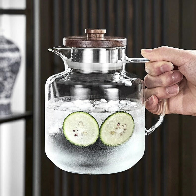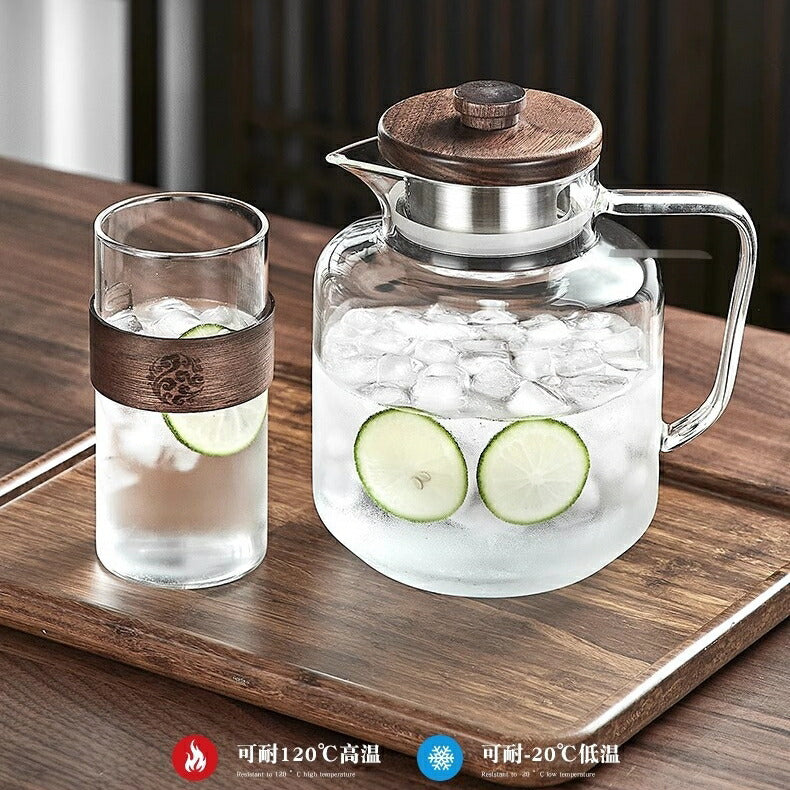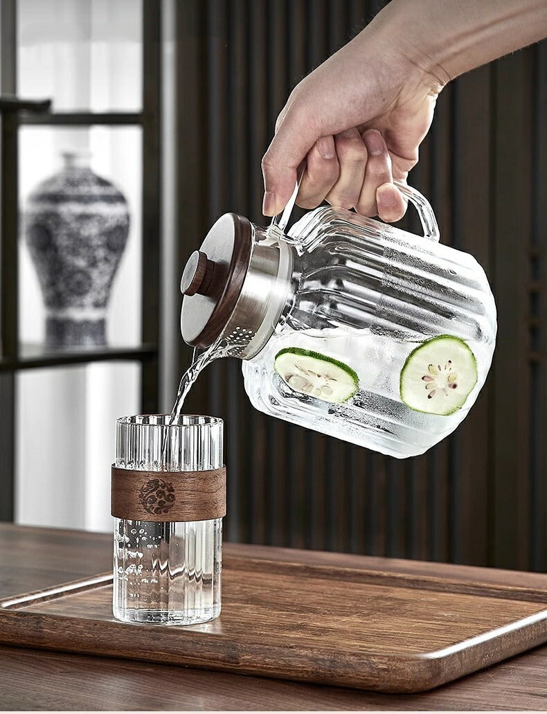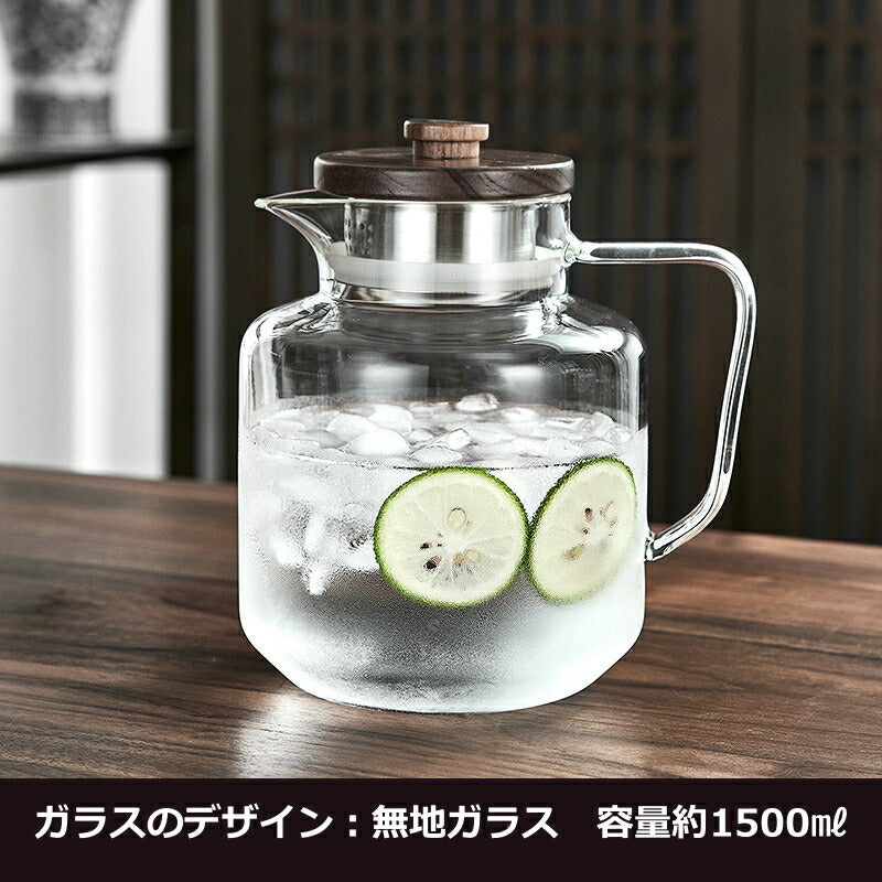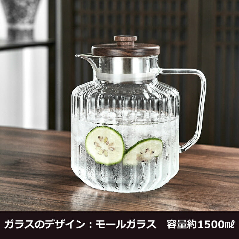 IwaiLoft レトロでかわいい モールガラス 冷水筒 耐熱ガラス スリムジャグ ガラスサーバー ガラスポット ピッチャー 1500ml 大容量 木蓋 麦茶ポット お茶ポット 水ジャグ ウォーターピッチャー ウォーターカラフェ 小 透明 ジャグ 水差し ドリンクピッチャー ピクルスポット